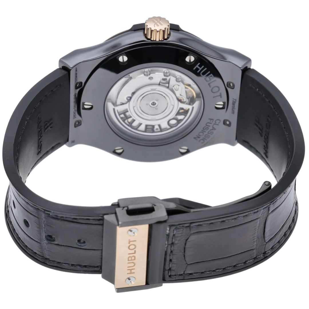 A Hublot Classic Fusion Watch, Black Leather Strap with a Black Ceramic Case, 18ct Rose Gold Bezel & Clasp on a Black Dial