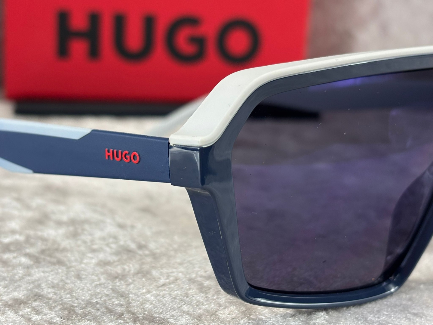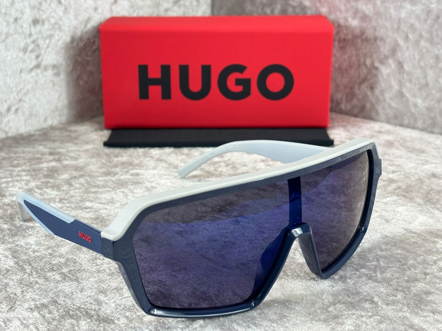 A Brand new and unused, these Hugo Boss Mask sunglasses make an immediate impact with their bold, sport-inspired silhouette. The striking blue grey colourway combines a structured white upper frame with deep blue detailing, creating a dynamic contrast that feels modern and energetic. The oversized shield-style lens delivers a streamlined, wraparound look, offering both visual impact and confident everyday wear.