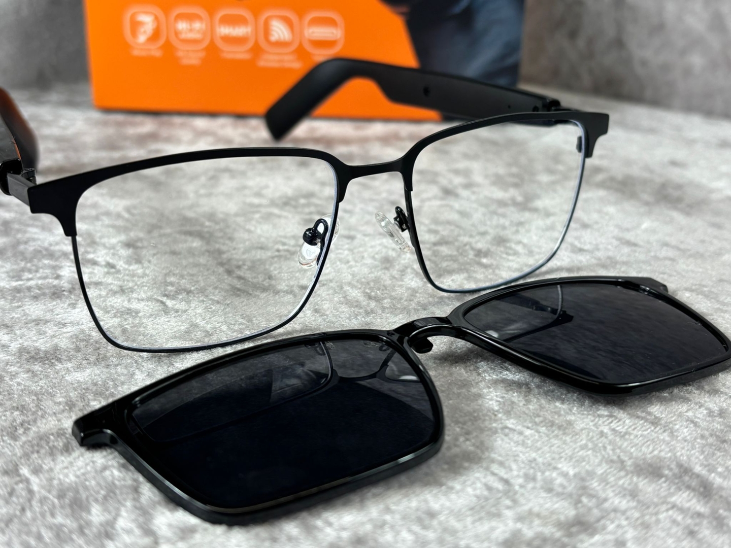 A brand new, unused and boxed pair of interchangeable smart glasses and sunglasses, combining a classic frame design with hands-free audio, built-in call functionality, open-ear sound, and easy lens swapping for seamless everyday and outdoor use.