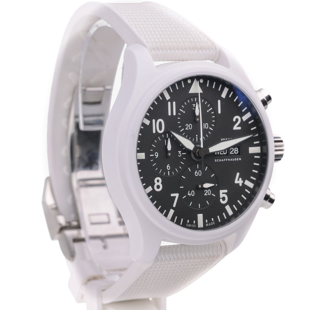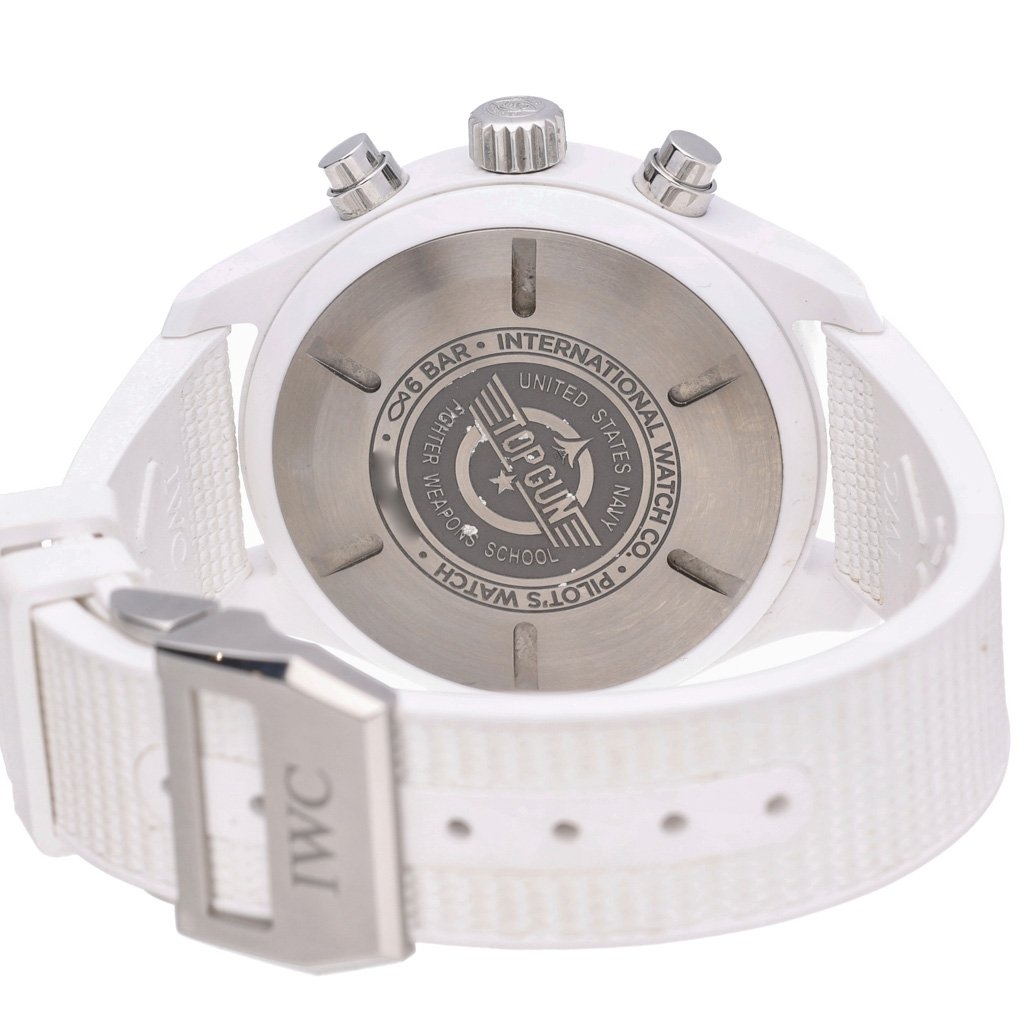 An IWC Pilot Chronograph Top Gun Watch, White Rubber Strap with a Ceramic Case & Clasp/Bezel and a Black Dial.