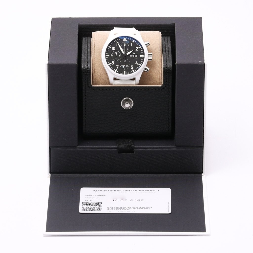 An IWC Pilot Chronograph Top Gun, model number IW389105, represents a fusion of cutting-edge design and advanced technology crafted for the modern aviation enthusiast. Released in 2023, this watch stands out with its robust 44mm ceramic case, offering both durability and a sleek, stealthy appearance. The ceramic material ensures excellent scratch resistance and a sophisticated matte finish.