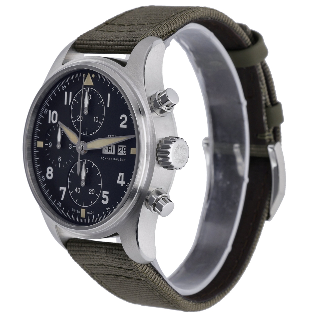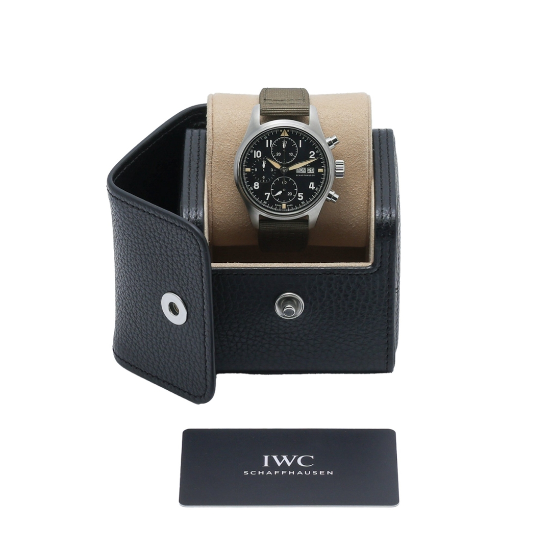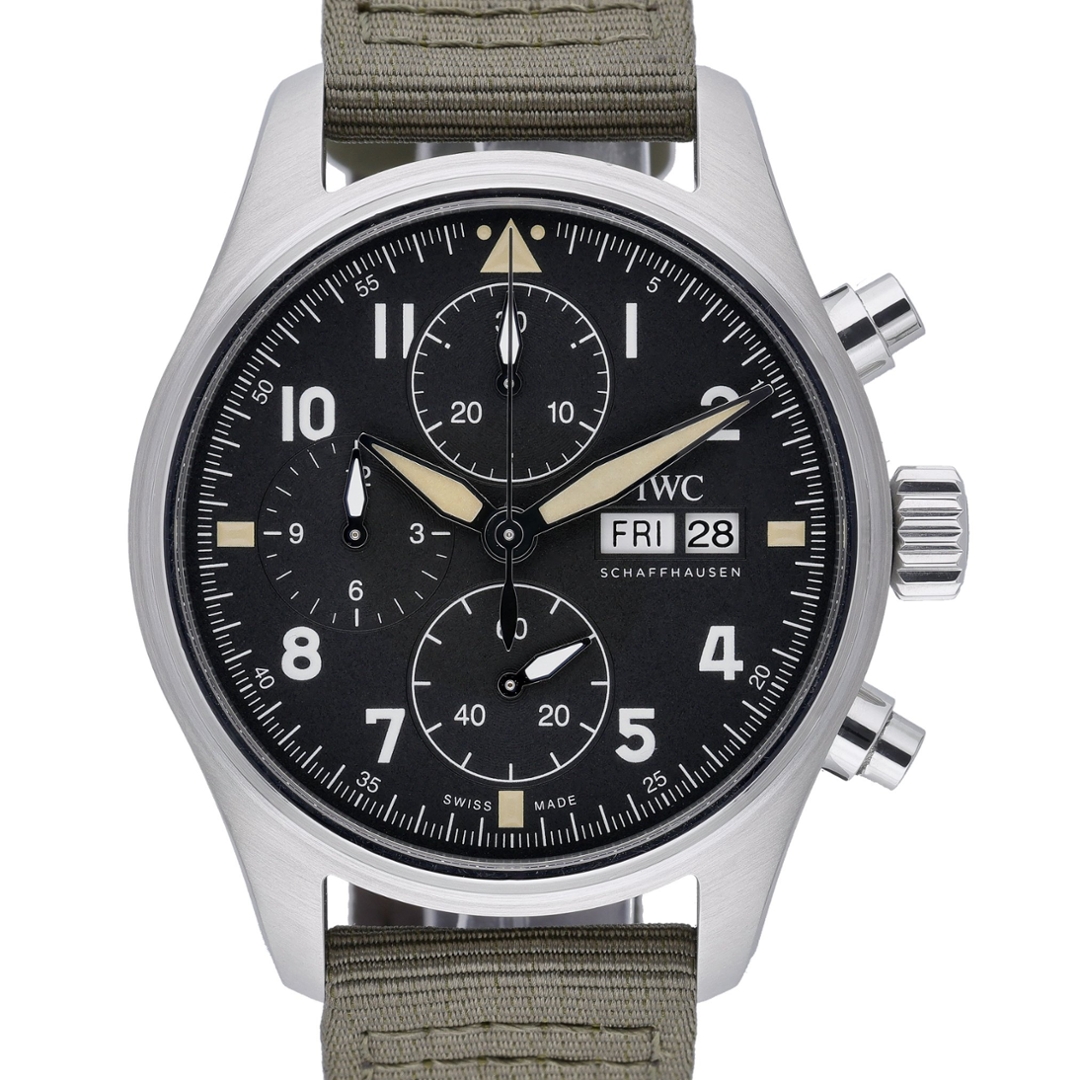 Powering this model is the in-house IWC Calibre 69380 automatic movement — a highly reliable, column-wheel chronograph mechanism that delivers outstanding accuracy and a power reserve of up to approximately 46 hours. Its mechanical efficiency and durability reflect IWC’s long-standing expertise in creating precision instruments for professional pilots. The green fabric strap, complemented by a stainless steel clasp, enhances the watch’s military-inspired aesthetic and ensures lasting comfort.