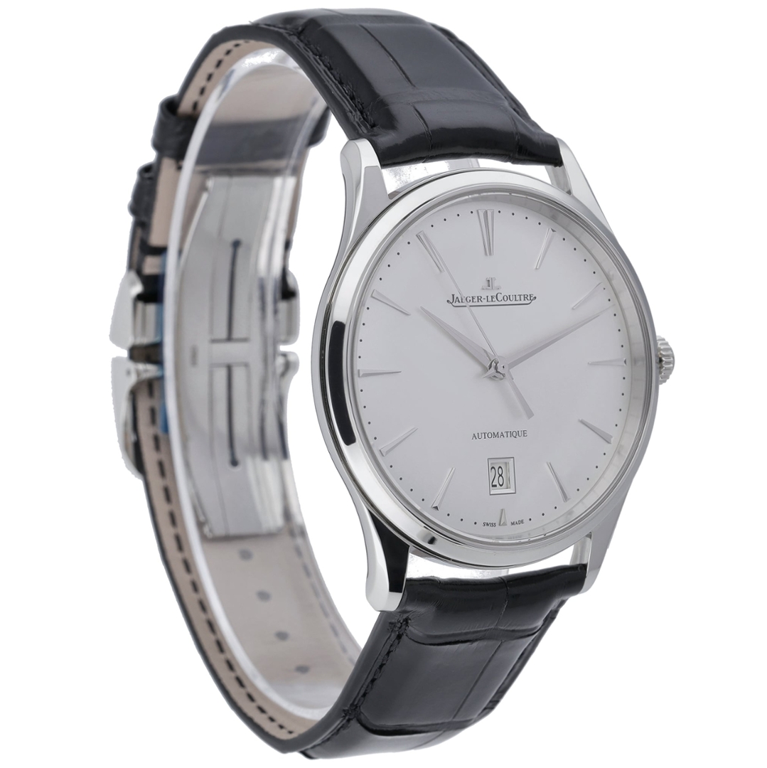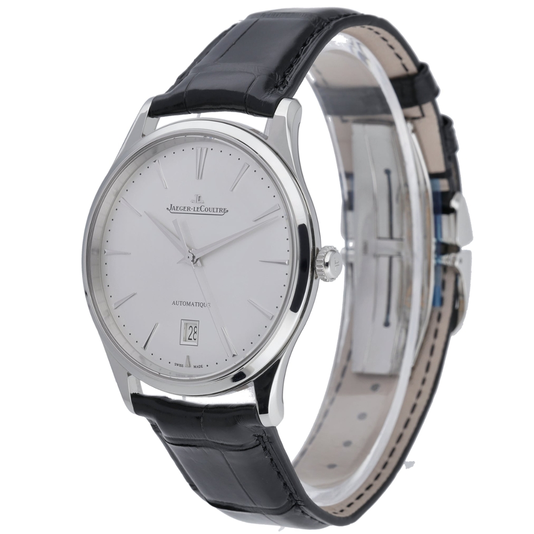 A Jaeger-LeCoultre Master Ultra Thin Date presented on a black leather strap, paired with a stainless steel case and clasp and a refined silver dial. The 39mm case showcases the brand’s signature slim profile, with applied baton hour markers, elegant dauphine hands, and a discreet date aperture at six o’clock, maintaining a perfectly balanced, timeless design.