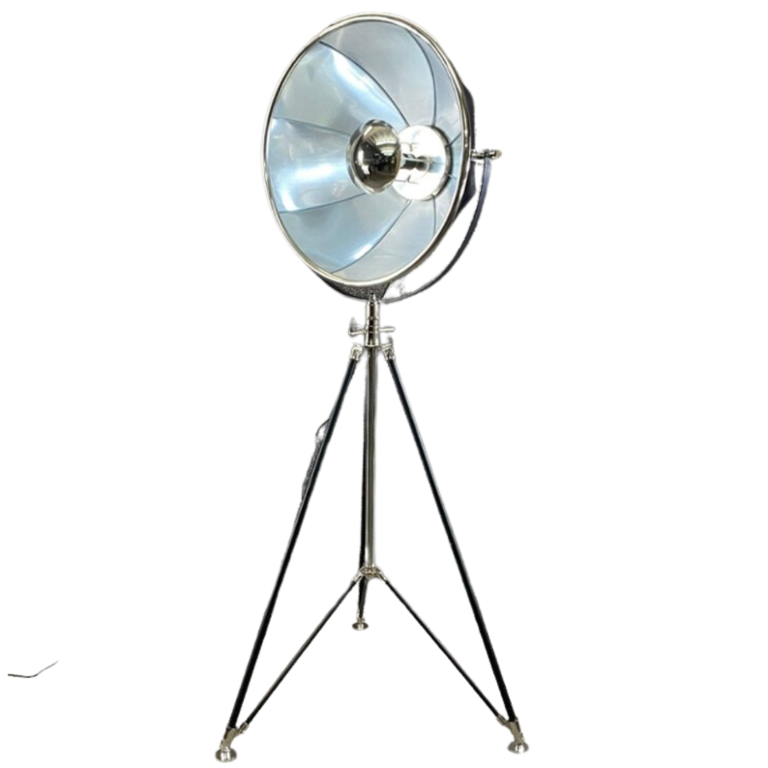 The lamp features a large reflective nickel-finish shade mounted on sleek black tripod legs, blending vintage character with modern sophistication. Its adjustable head allows you to direct light where it’s needed, making it both a striking feature piece and a practical lighting solution.