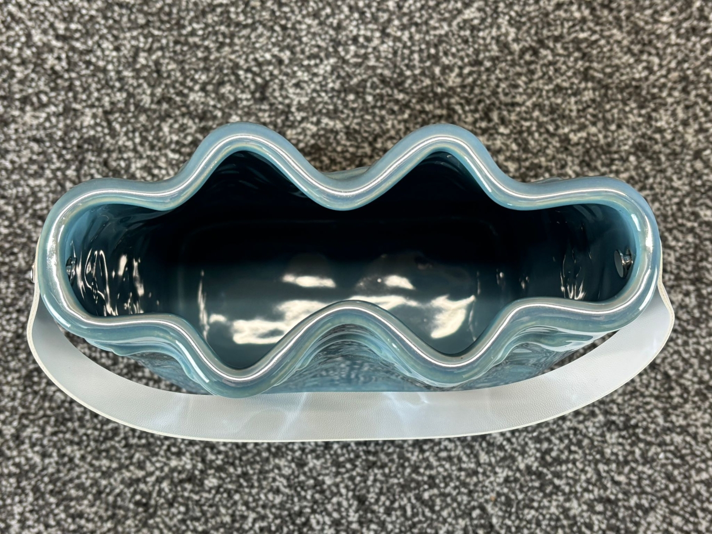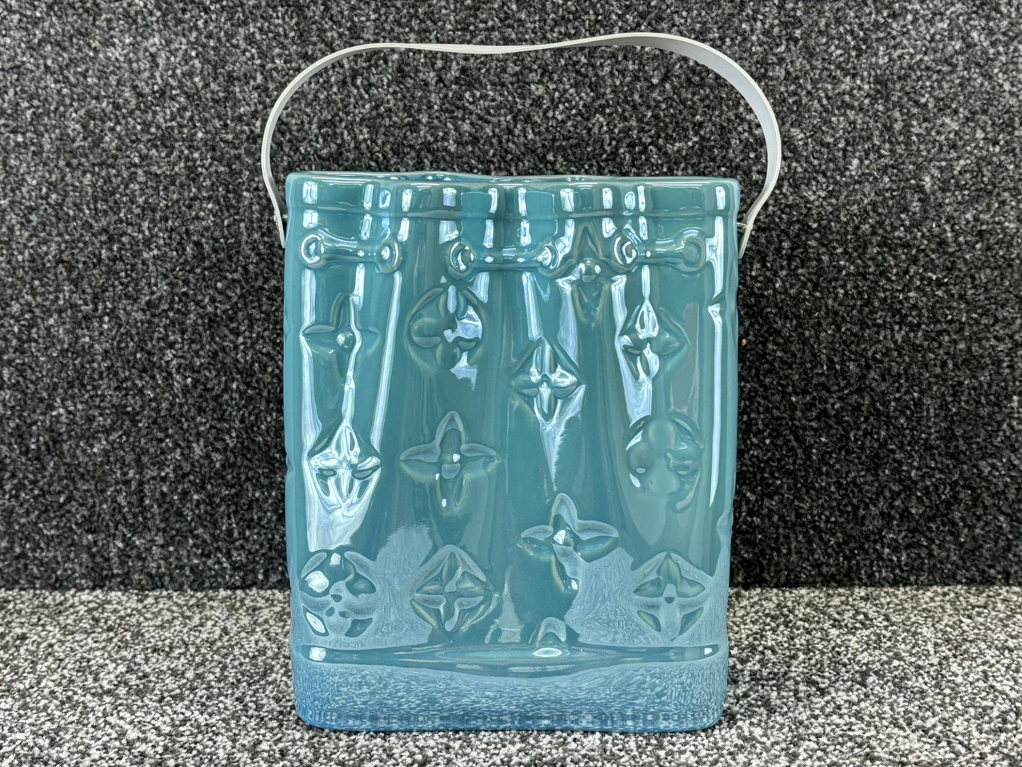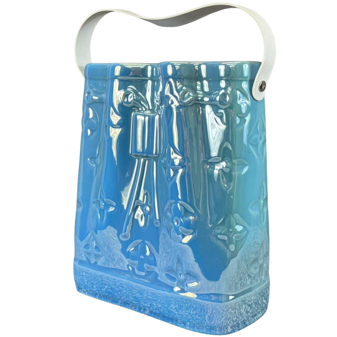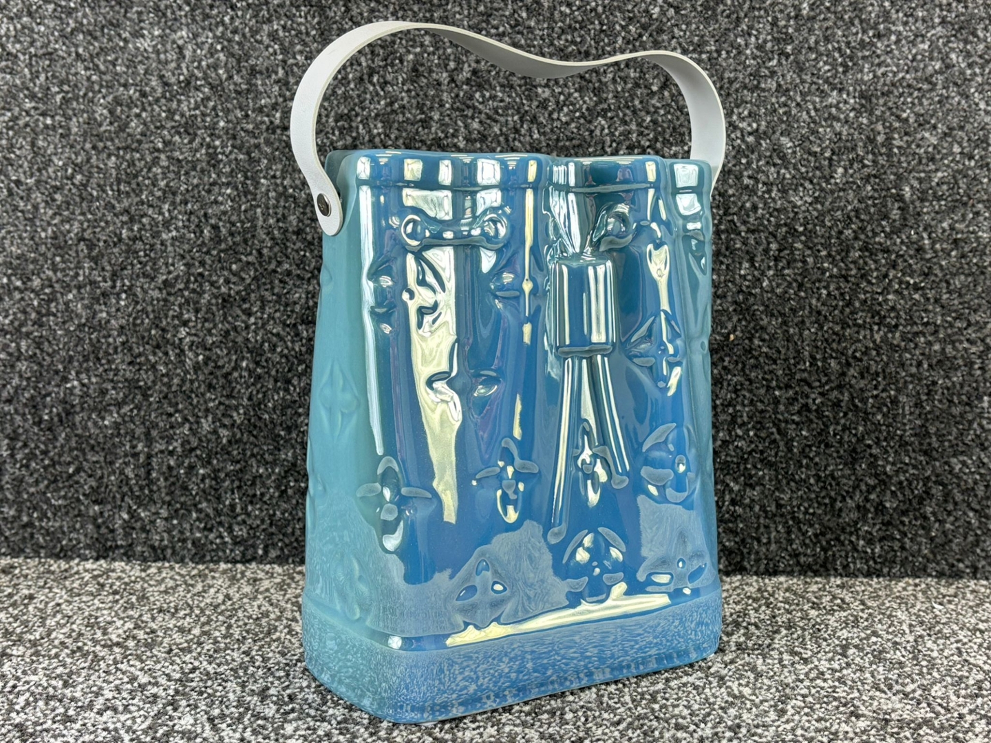 - > Large Blue Ceramic Handbag Vase with White Handle