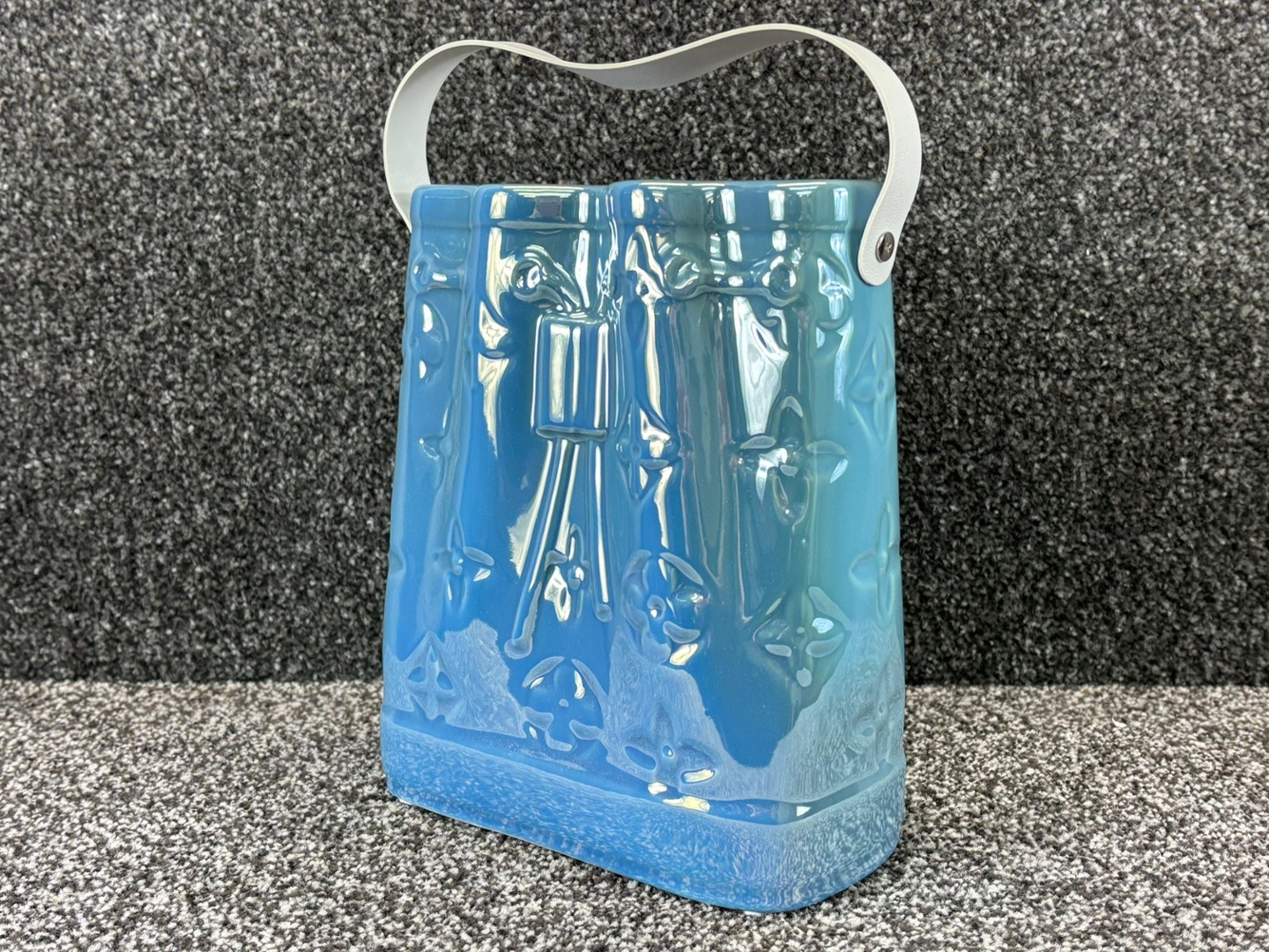 A Large Blue Ceramic Handbag Vase with a Blue Handle. Approx 23cm height, 19cm width, 10cm depth.