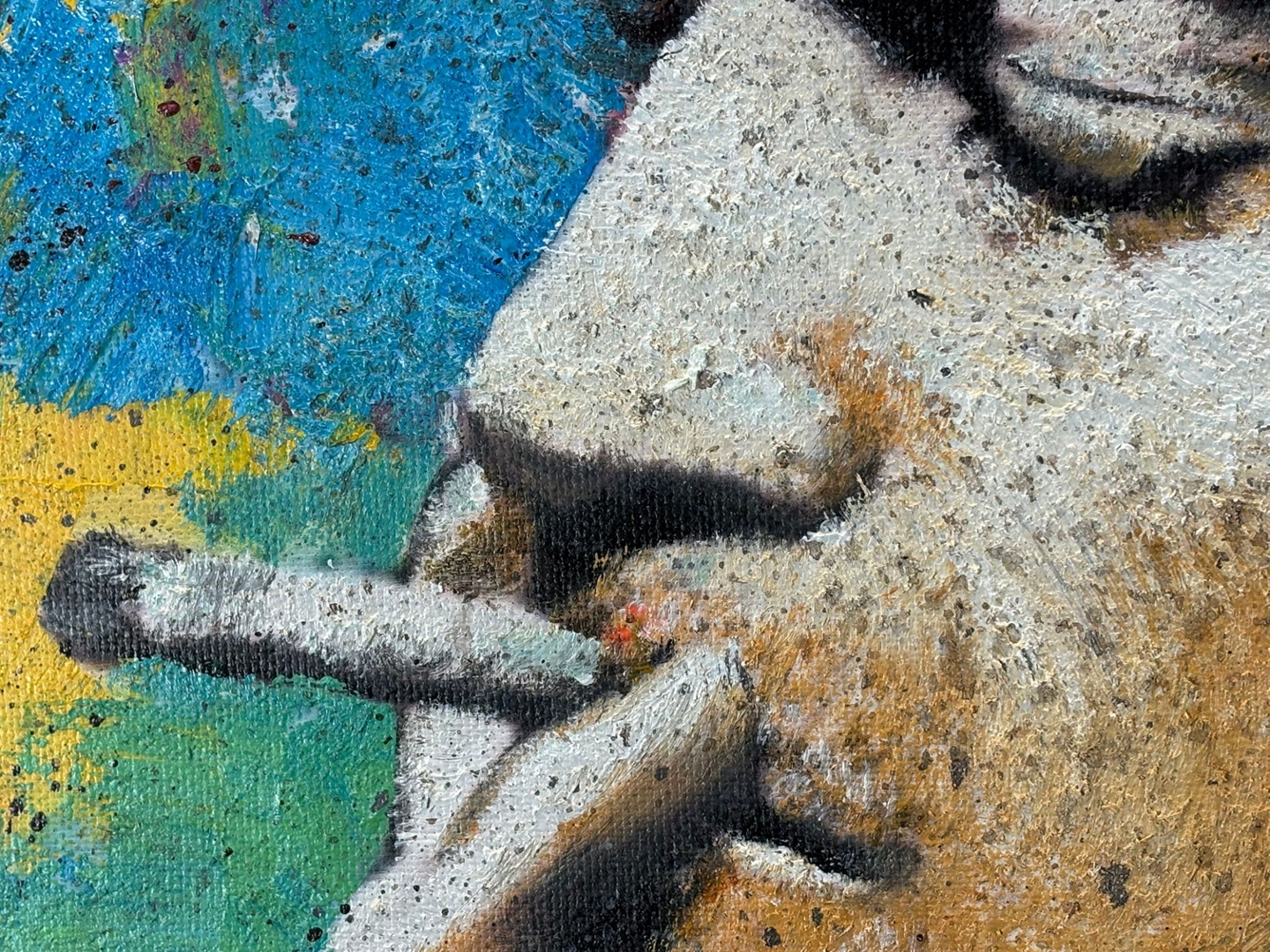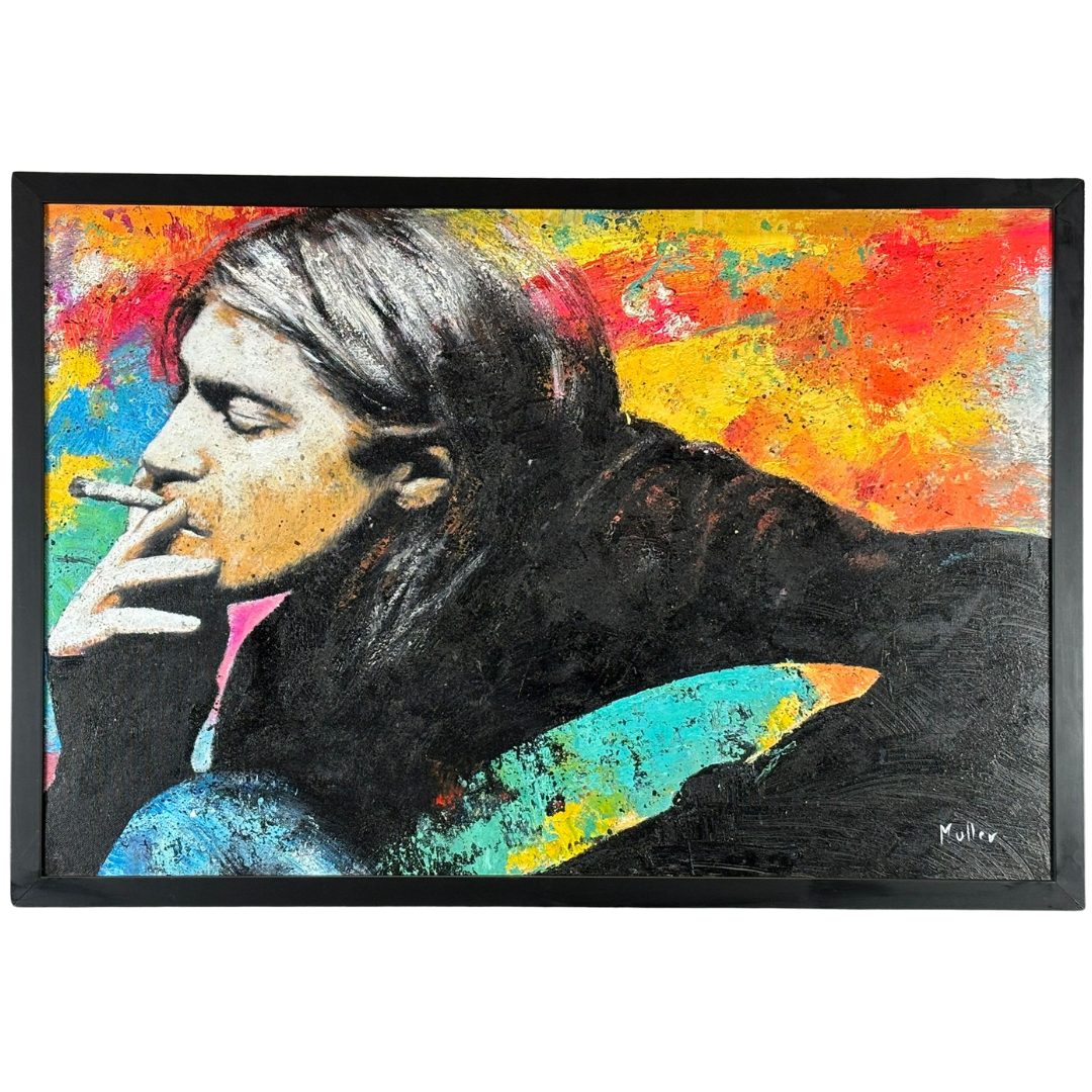 Muller contrasts Cobain’s monochrome likeness with an explosive background of fiery reds, yellows, and blues — a symbolic representation of the chaos, creativity, and rebellion that defined the grunge era. The textured surface and expressive brushwork add depth and grit, mirroring the authenticity and angst that Cobain brought to his art and his generation.