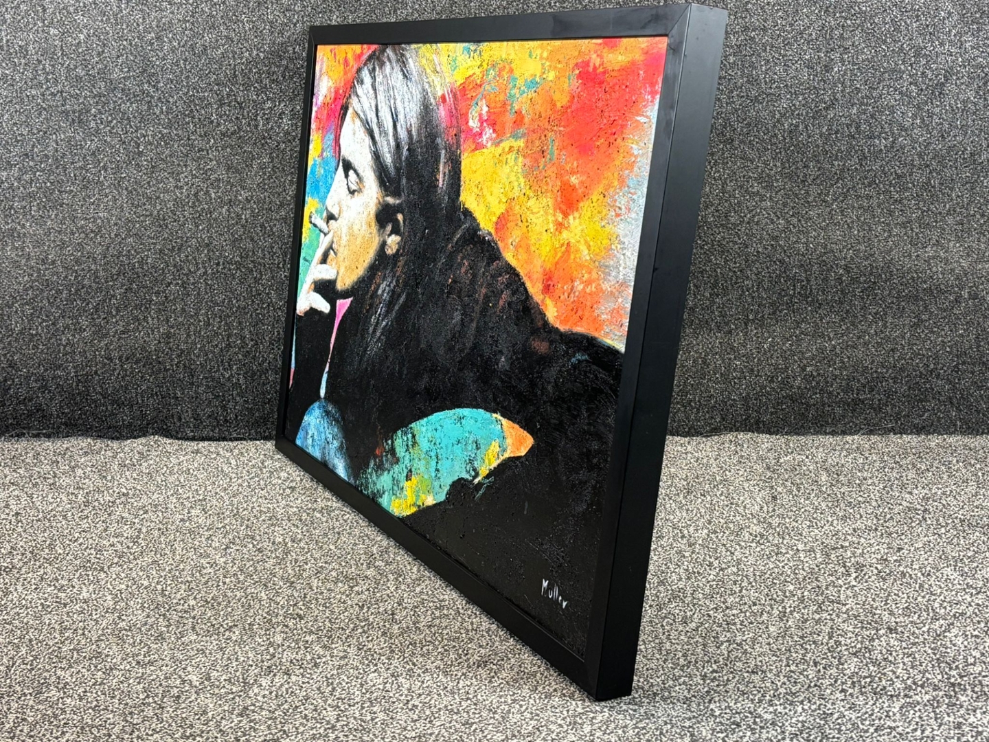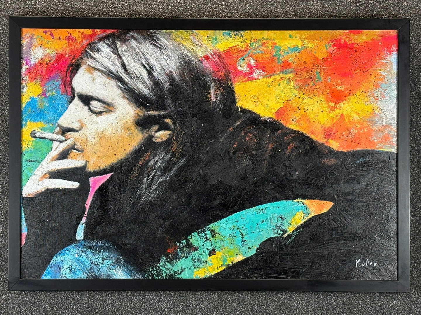 A black framed original oil painting by the artist Muller titled Kurt Cobain L'Icone Grunge.