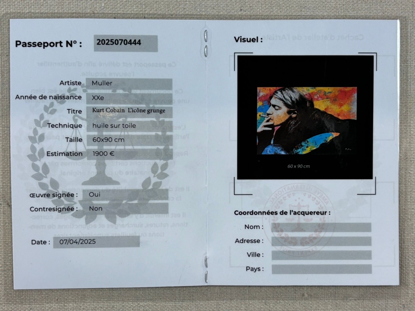 Presented in a sleek black frame and valued at €1900, Kurt Cobain – L’Icône Grunge stands as a moving tribute to a cultural legend. It’s an evocative piece that resonates with emotion, artistry, and the spirit of rock rebellion.