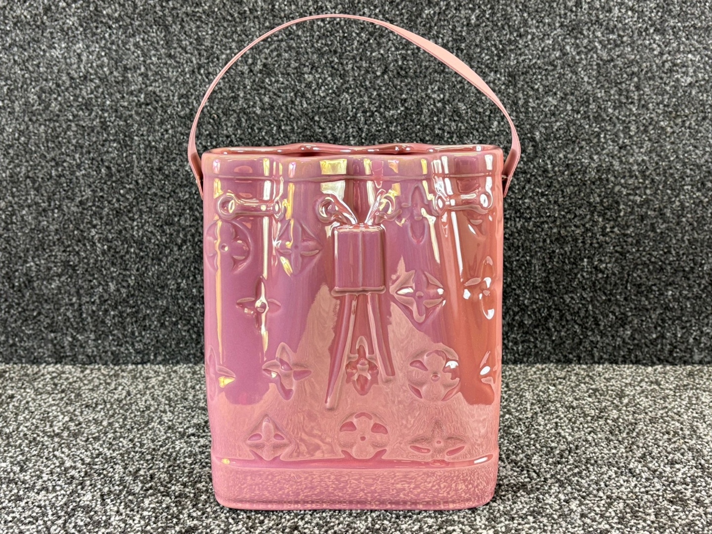 A large pink ceramic handbag vase that combines playful design with decorative elegance. Crafted in the form of a handbag, this unique vase features a glossy pink finish with embossed detailing that adds depth and texture. The structured shape and smooth ceramic surface create a contemporary look, while the matching pink handle completes the handbag-inspired design, making it a fun yet functional piece of home décor.