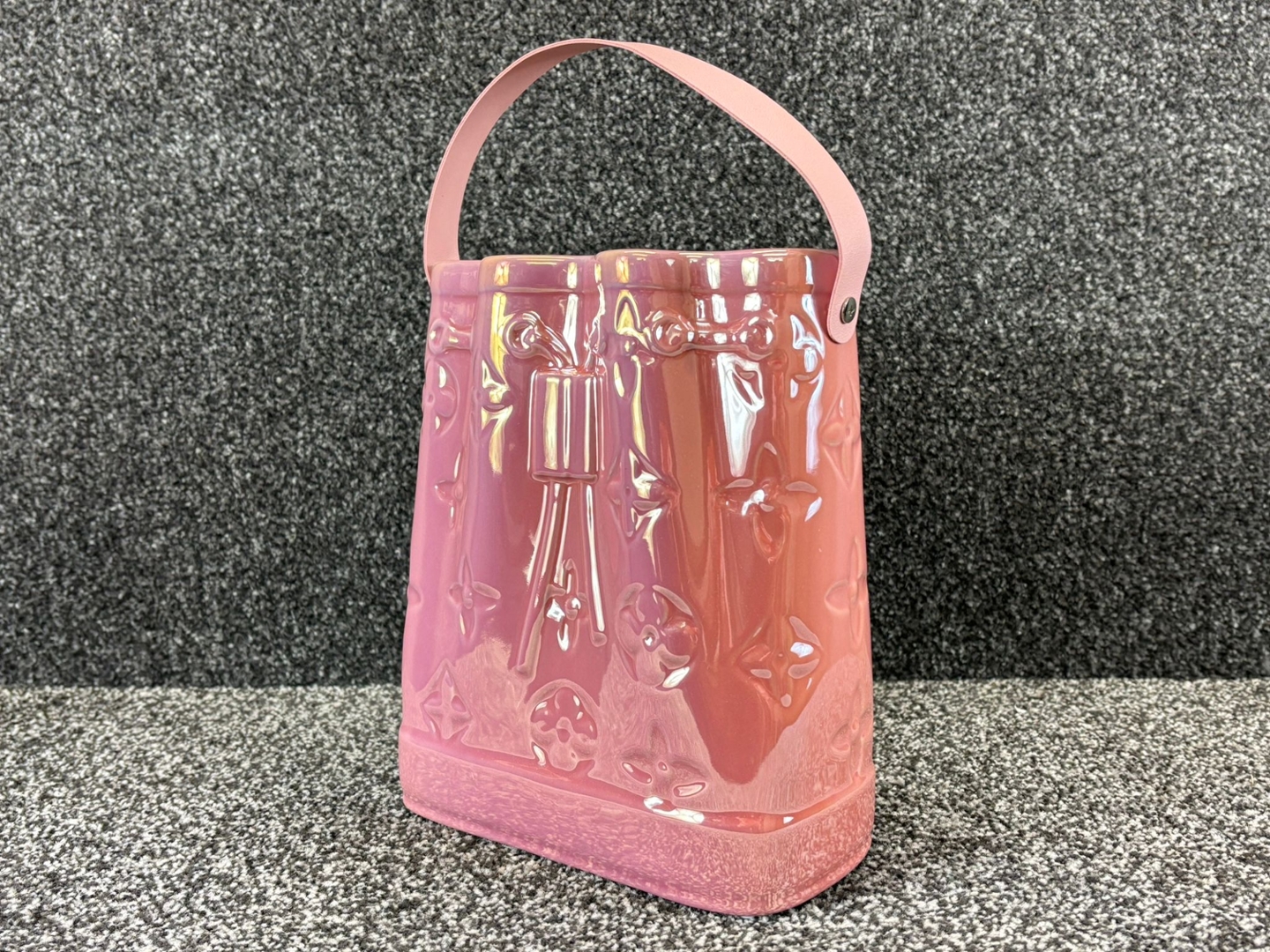 A Large Pink Ceramic Handbag Vase with a Pink Handle. Approx 23cm height, 19cm width, 10cm depth.