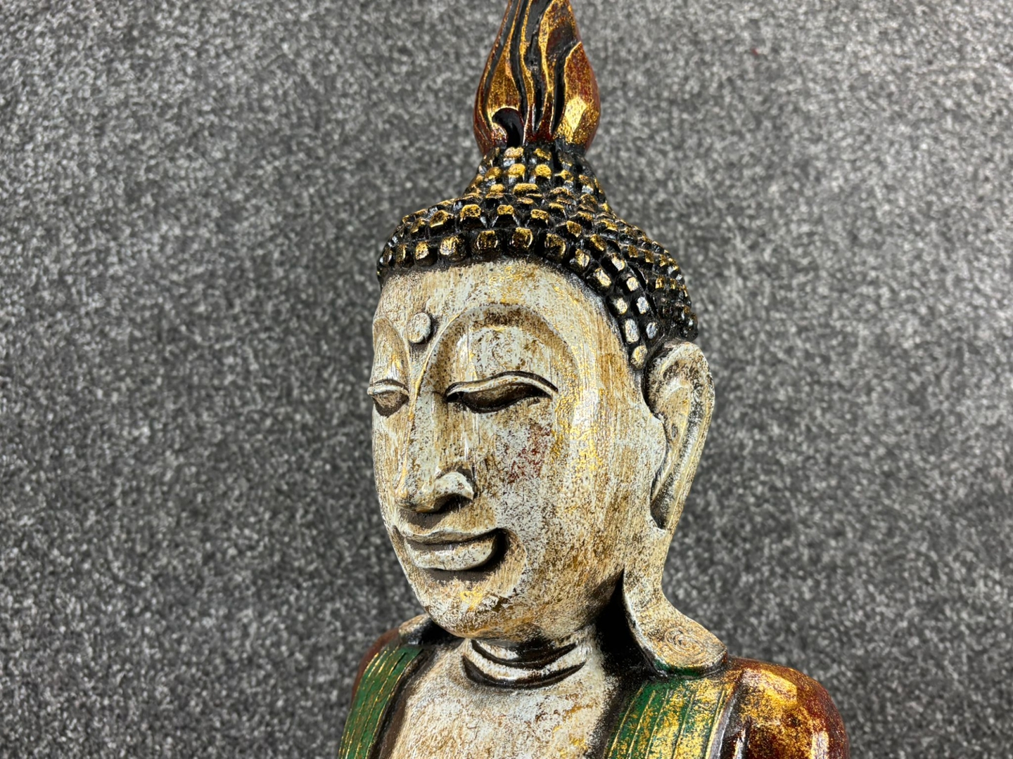 Depicted in a traditional standing pose, the Buddha exudes calm and compassion, with hands gently lowered in a gesture of peace. The sculpture features exquisite detailing throughout, highlighted by tones of gold, bronze, and green that bring warmth and depth to the design. The intricate carvings on the robe and serene facial expression reflect exceptional artistry and spiritual symbolism.