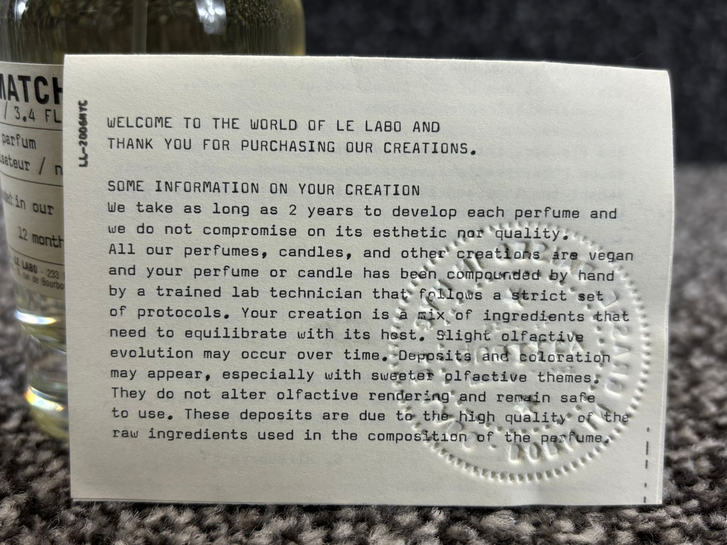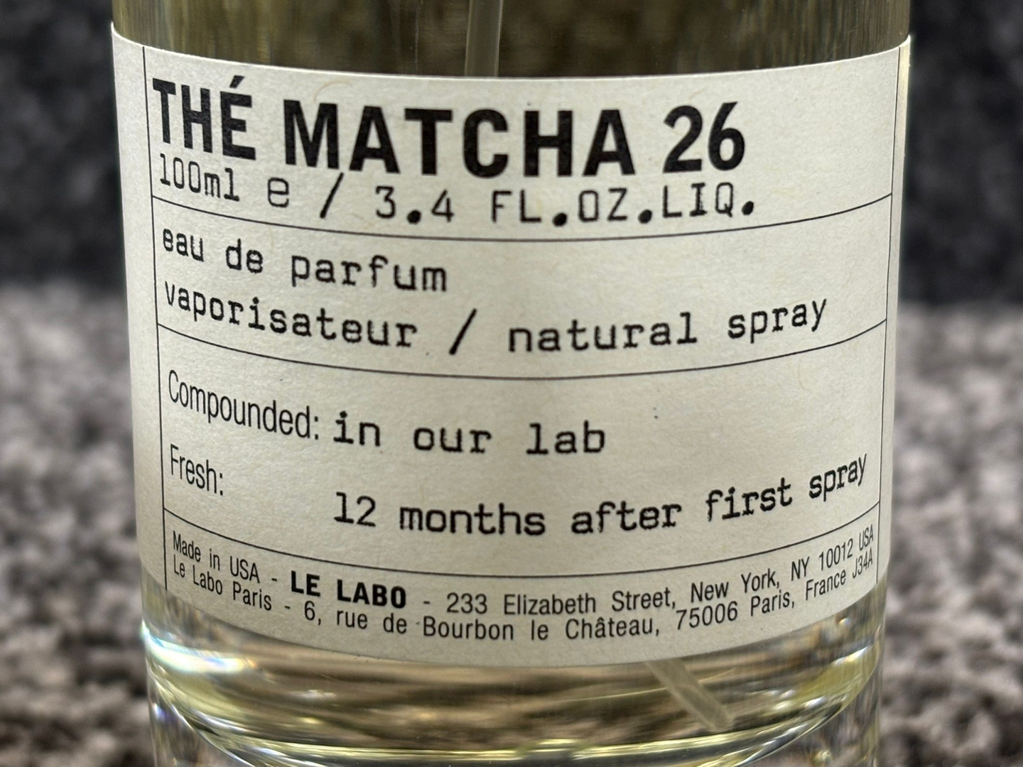 A bottle of Le Labo - The Matcha 26 Eau De Parfum.