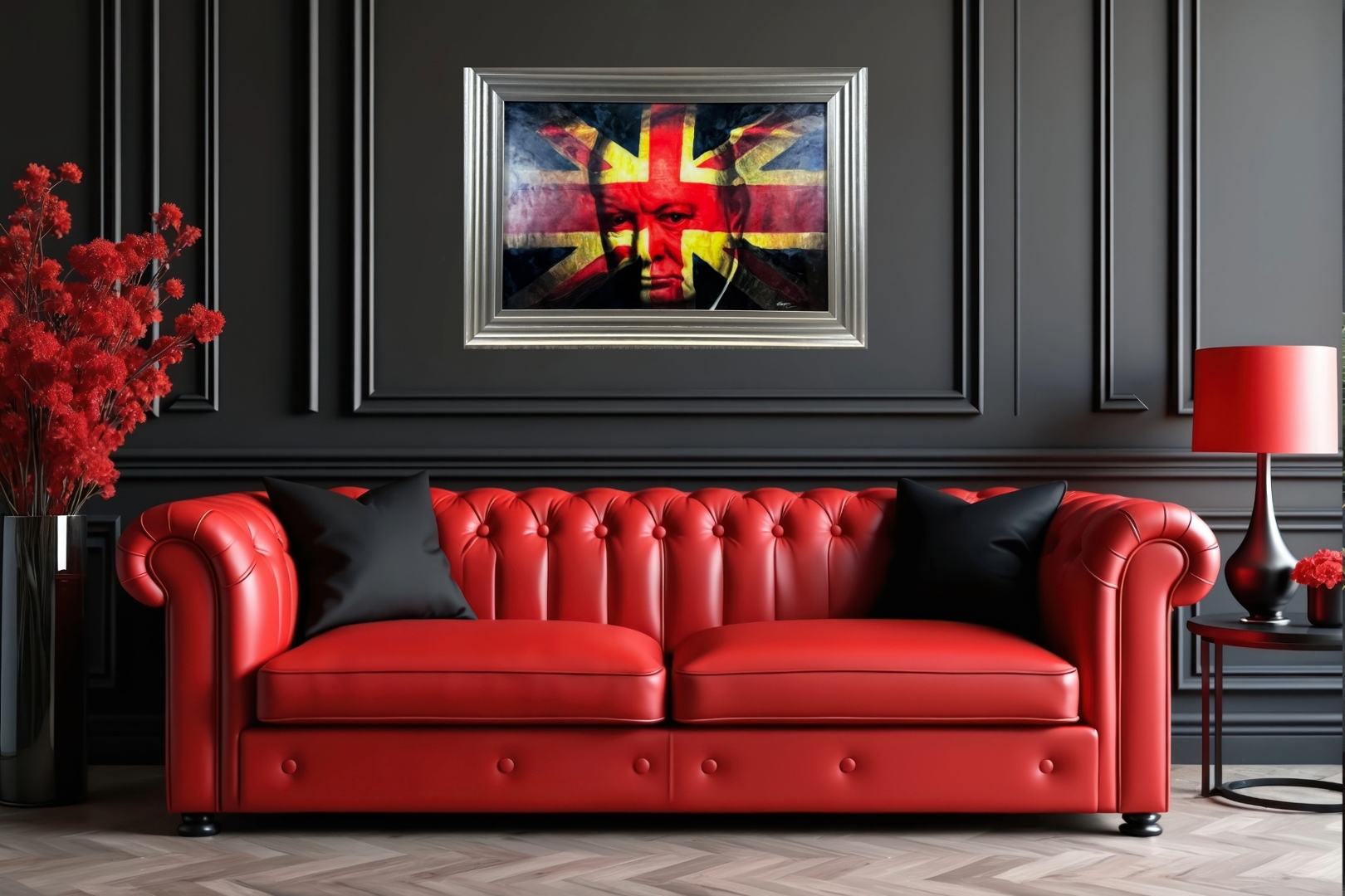 A brand new silver-framed liquid art picture that commands attention, this striking piece showcases an intense and vibrant image of Winston Churchill blended seamlessly with the Union Jack. The high-gloss liquid art finish enhances every colour and contour, giving the flag’s bold tones a luminous depth while Churchill’s expression emerges with a powerful, almost three-dimensional presence.