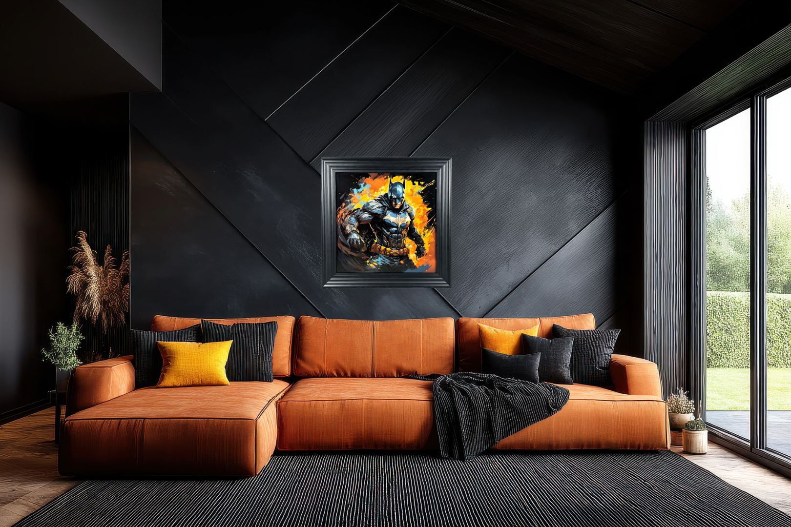 A brand new black framed liquid art picture, this explosive portrait of Batman is a bold and electrifying homage to the Dark Knight. Measuring 86cm in height and width, this powerful piece showcases Gotham’s iconic hero in dynamic motion, ready for action with his cape sweeping behind him and intensity in his eyes. His armoured suit, painted in striking shades of deep grey and metallic blue, glows with depth and detail against a backdrop of fiery orange and yellow splashes.