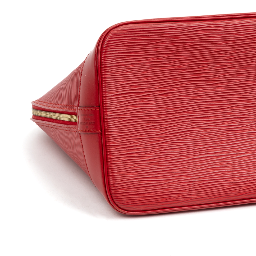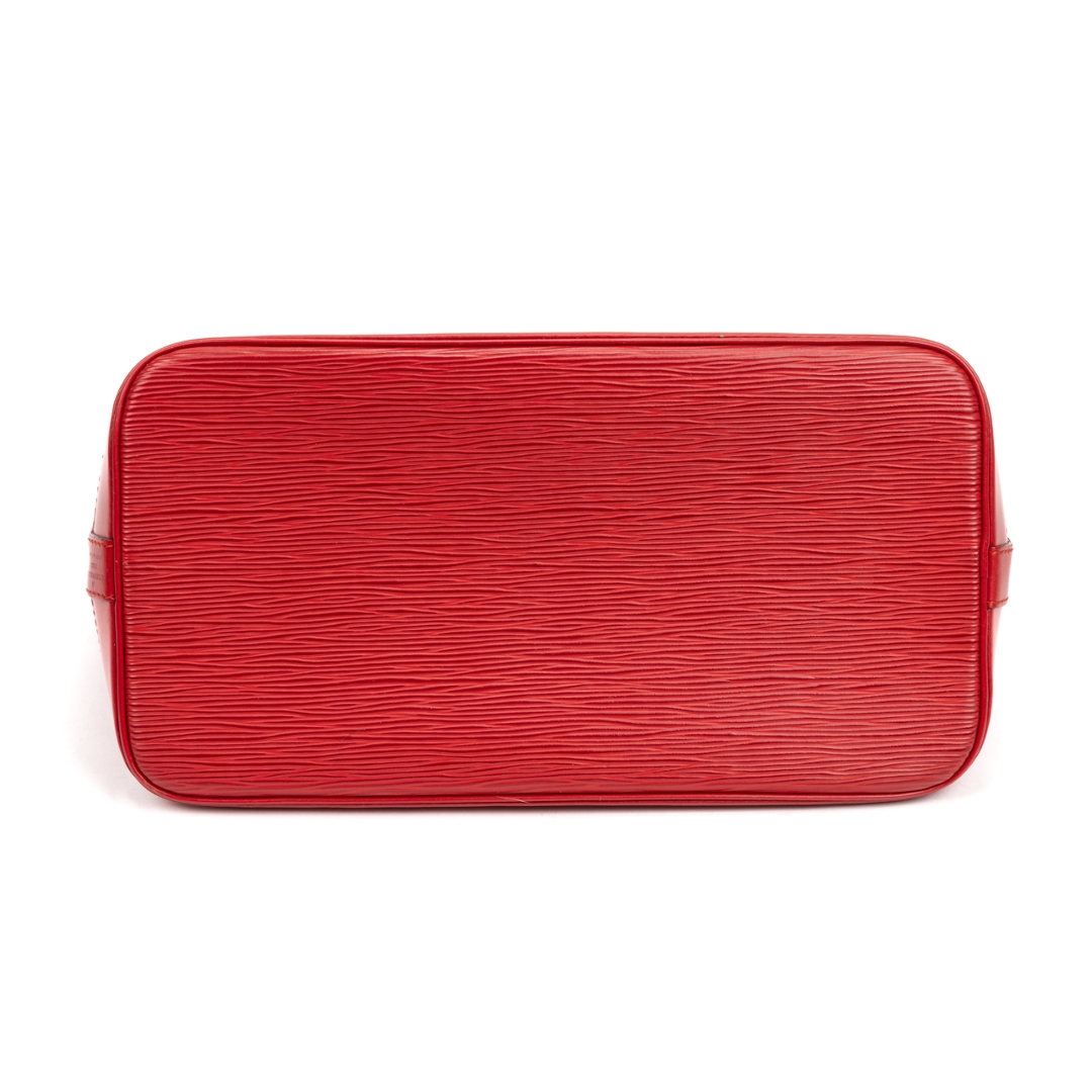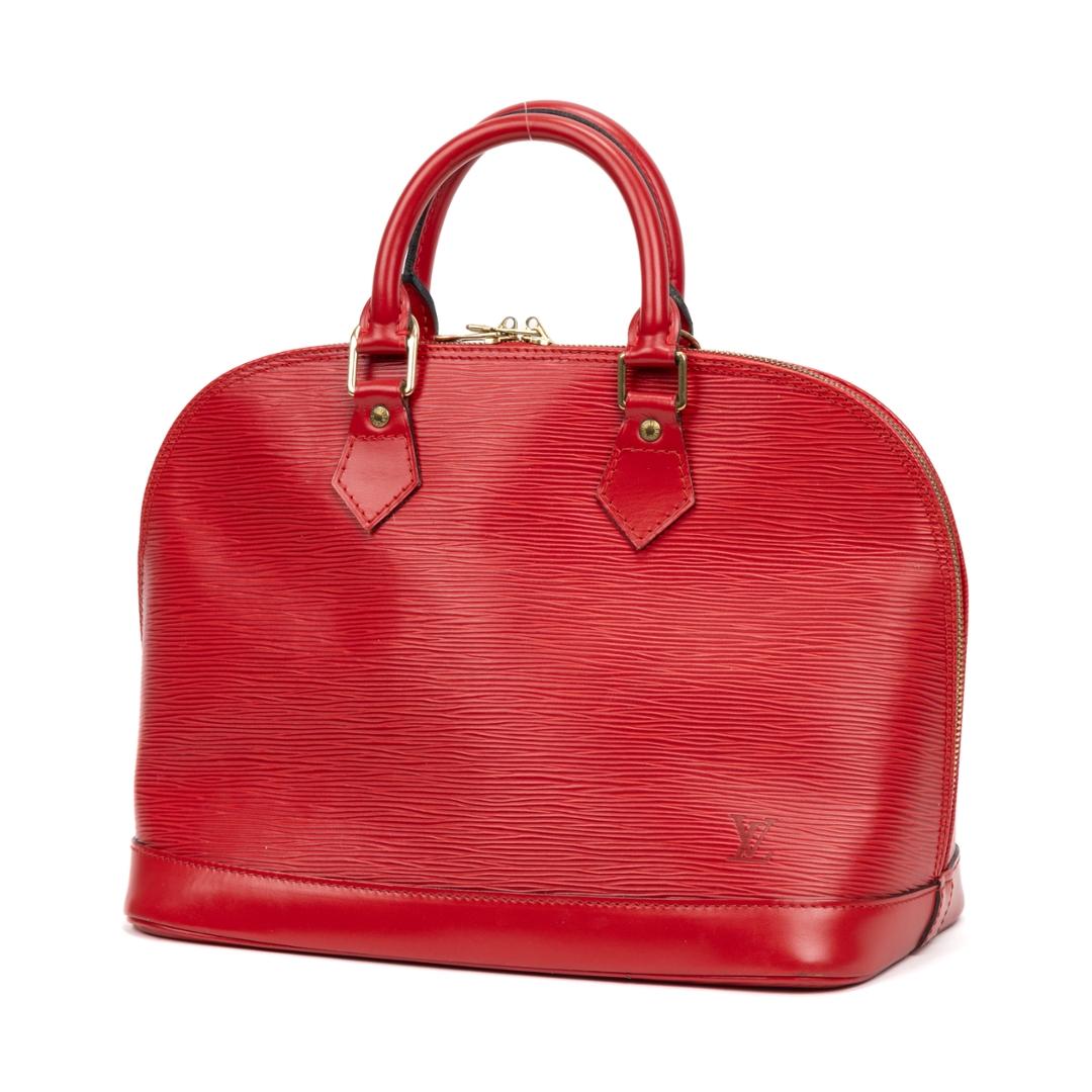 A vintage Louis Vuitton red calf leather Alma bag with a certificate of authenticity. Approximately 23cm height, 30cm width.