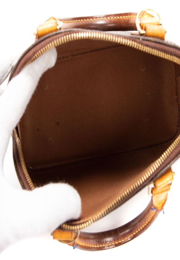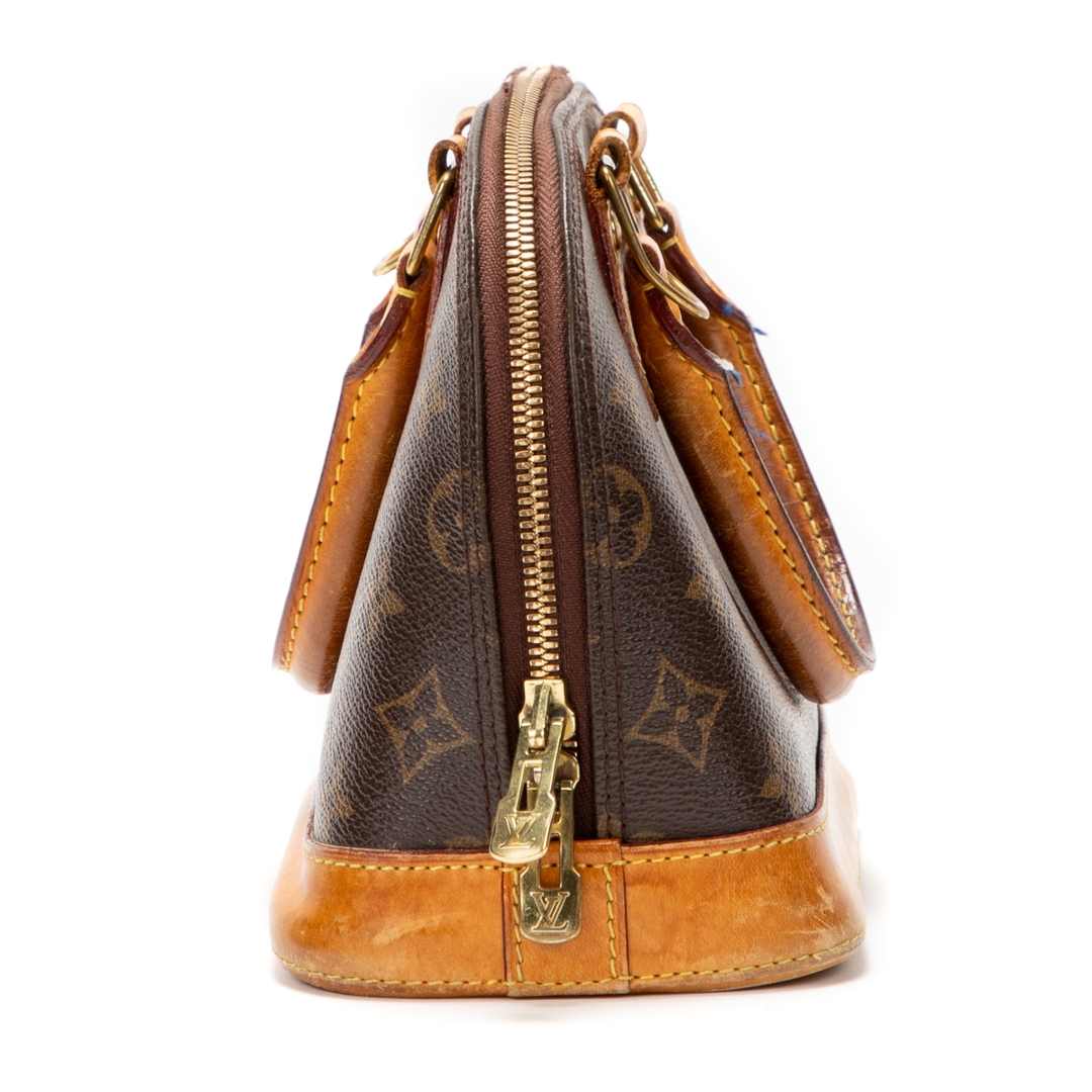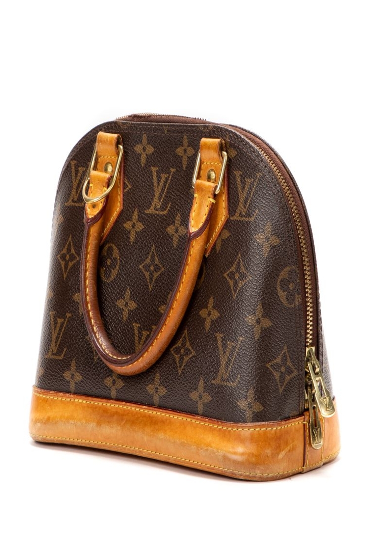 A vintage Louis Vuitton Alma bag crafted in the house’s iconic brown Monogram coated canvas, presenting a compact and timeless interpretation of this instantly recognisable silhouette. The structured dome shape is complemented by natural leather trim, dual rolled top handles, and gold-tone hardware, while the double zip closure ensures secure and practical use. Measuring approximately 18cm in height and 24cm in width, it offers a smaller, refined profile ideal for carrying daily essentials.