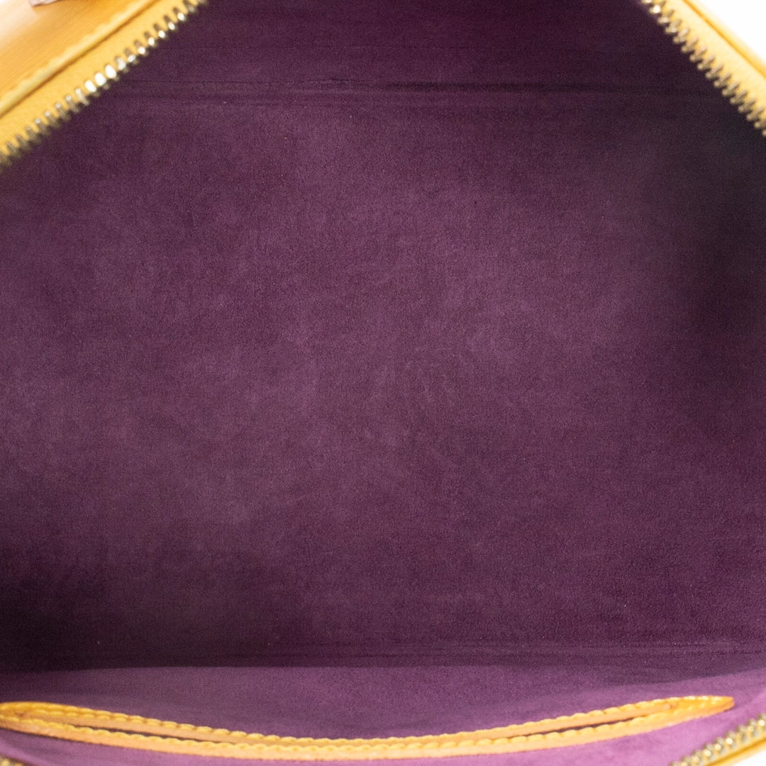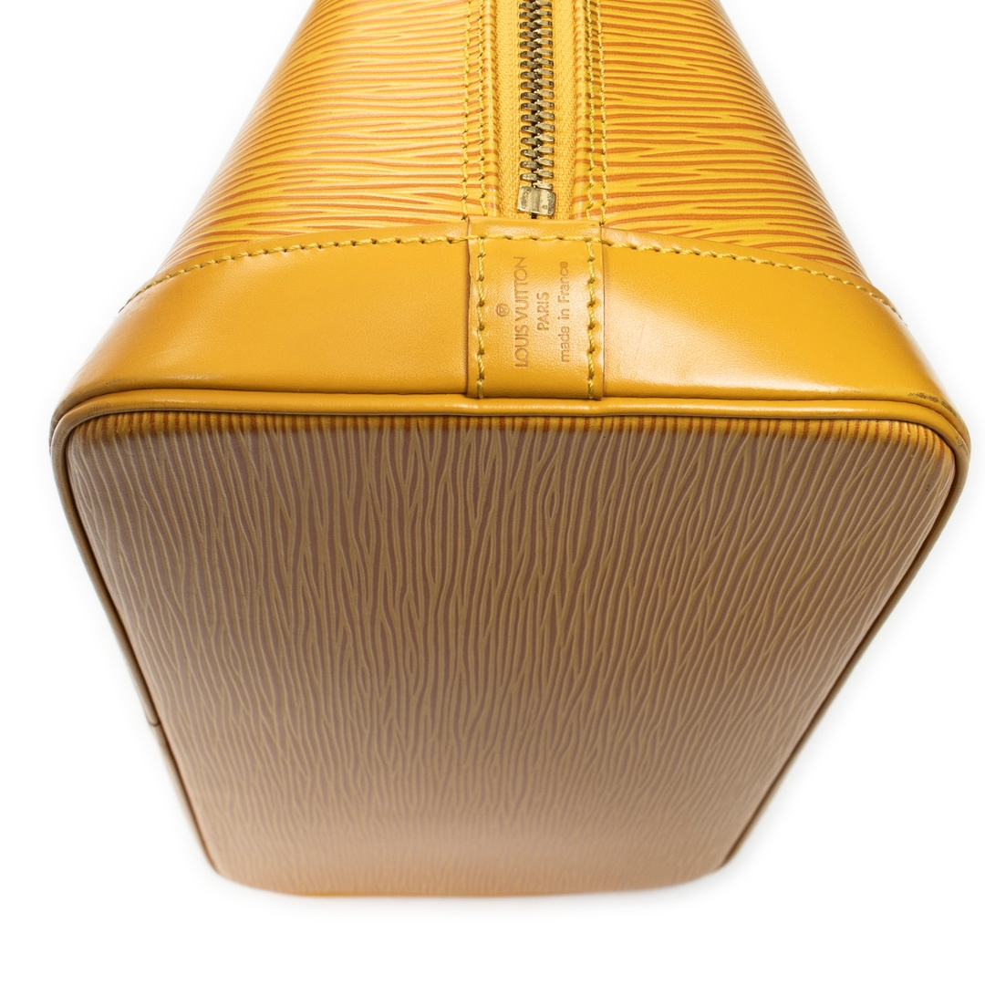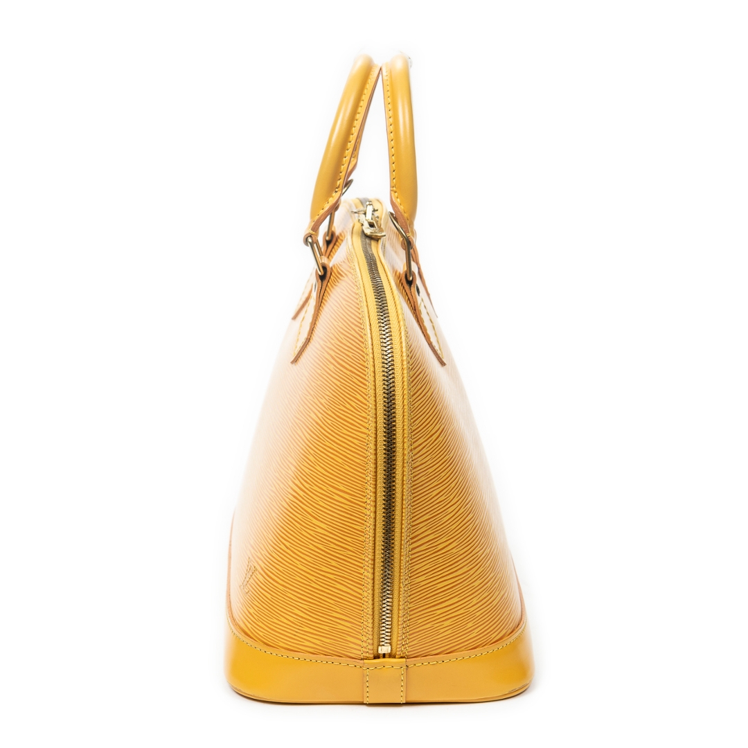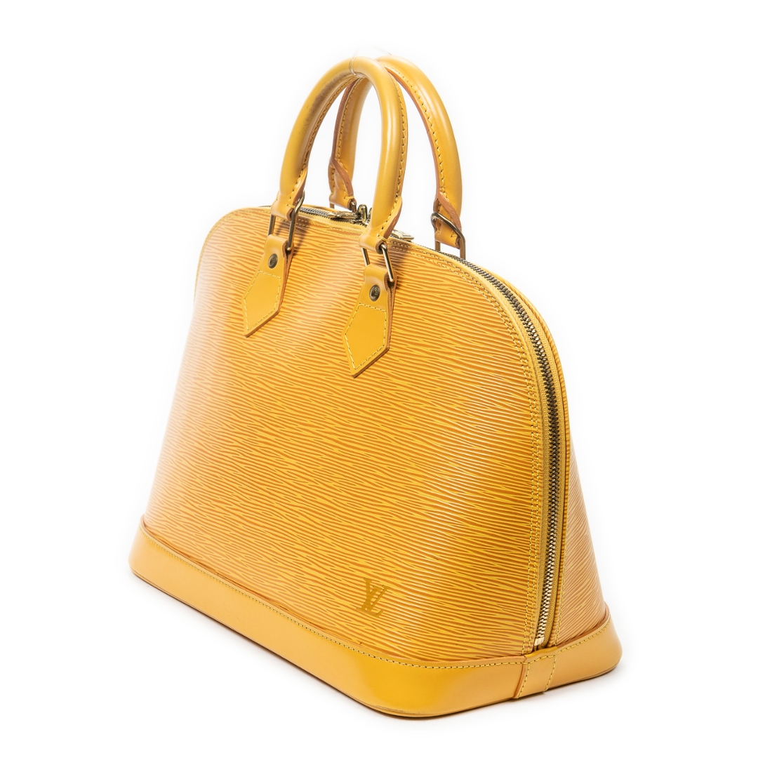 A vintage Louis Vuitton Alma bag crafted in vibrant yellow calf leather, offering a bold and distinctive take on the house’s iconic structured silhouette. The elegant dome-shaped design is complemented by dual rolled top handles, refined leather detailing, and gold-tone hardware, while the secure double zip closure ensures practicality for everyday use. Measuring approximately 23cm in height and 30cm in width, it presents a well-balanced size suited to both daily wear and statement styling.