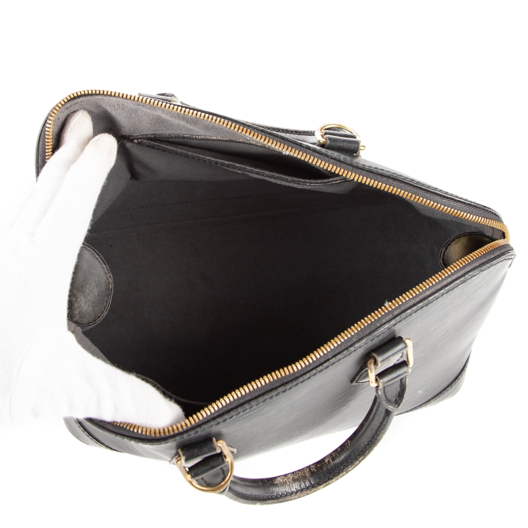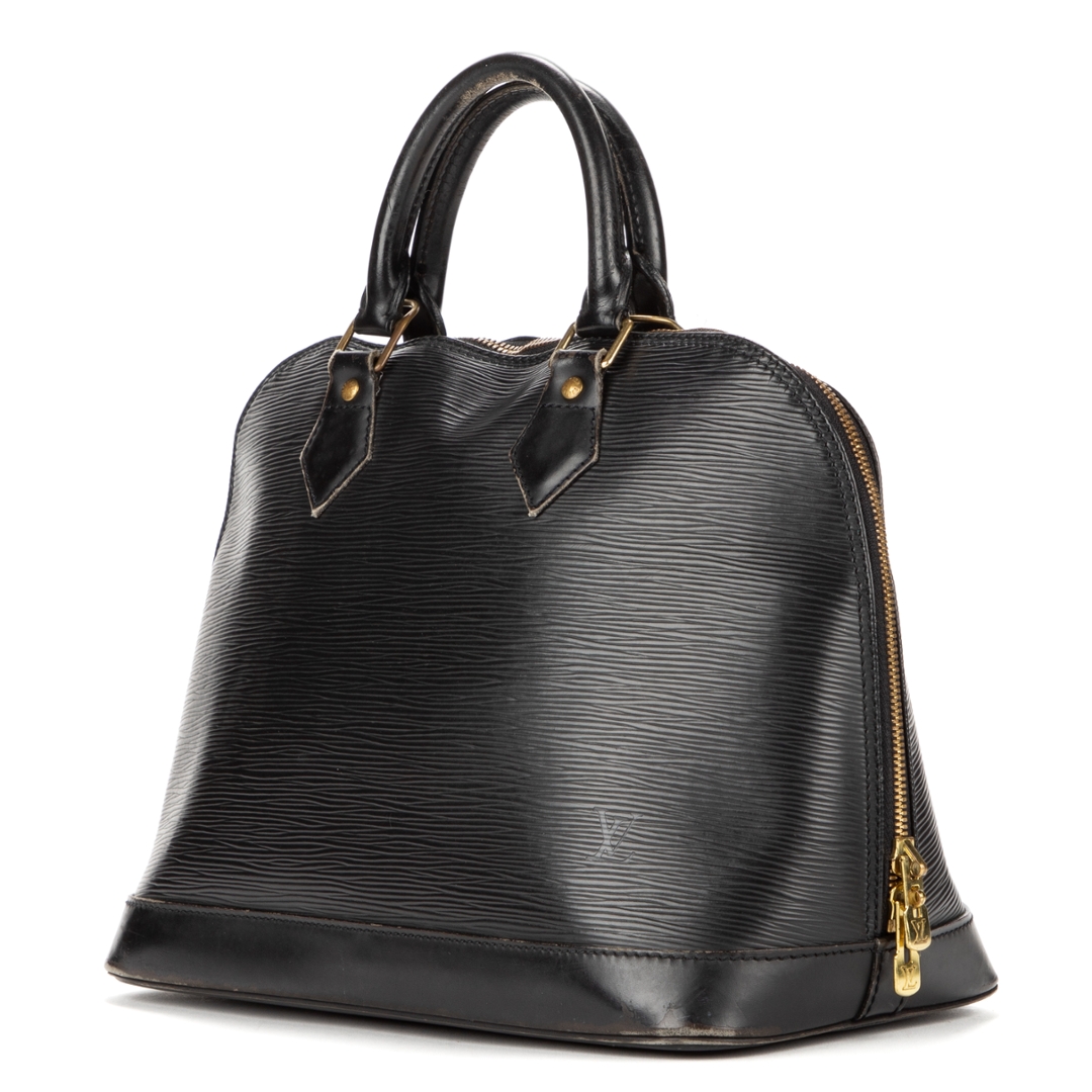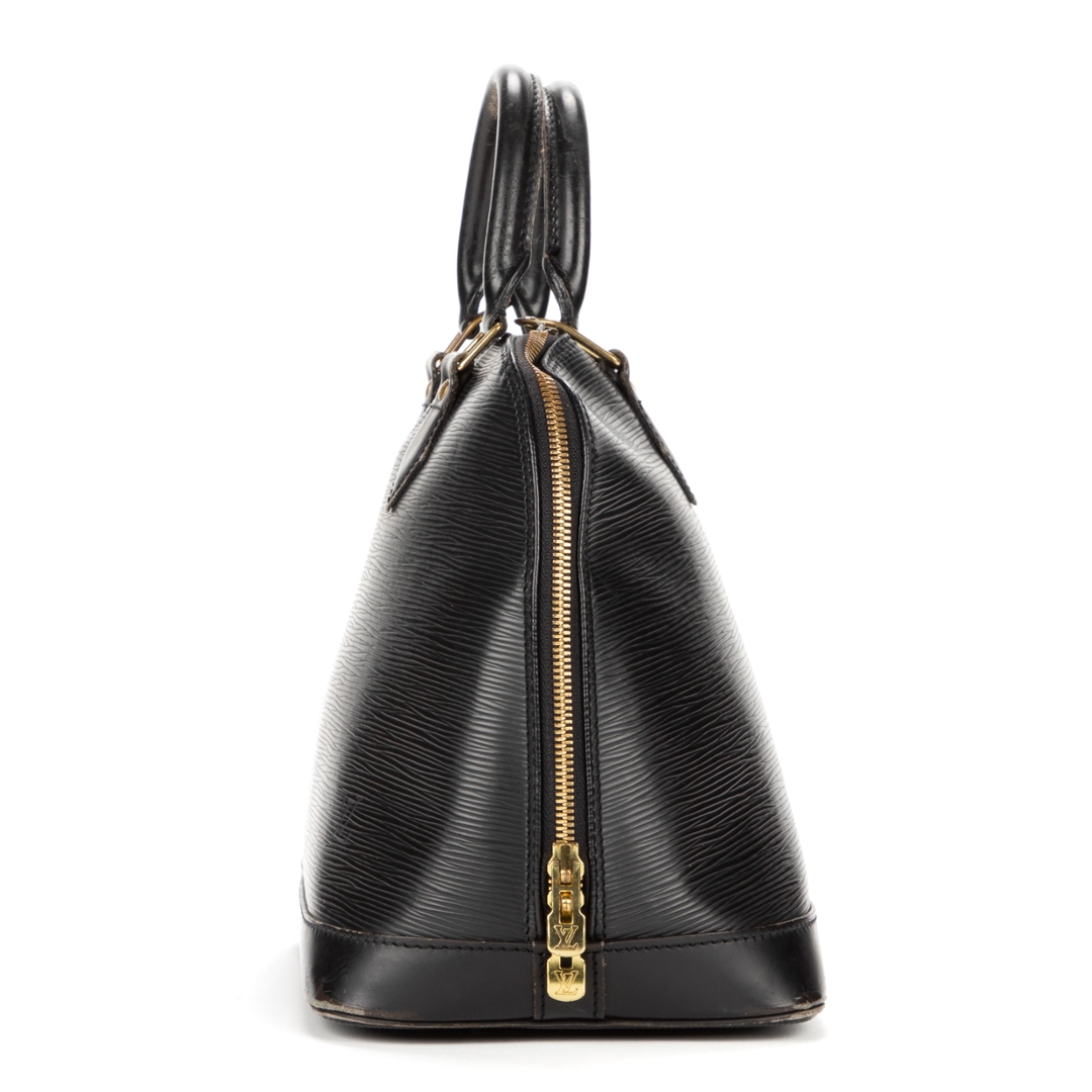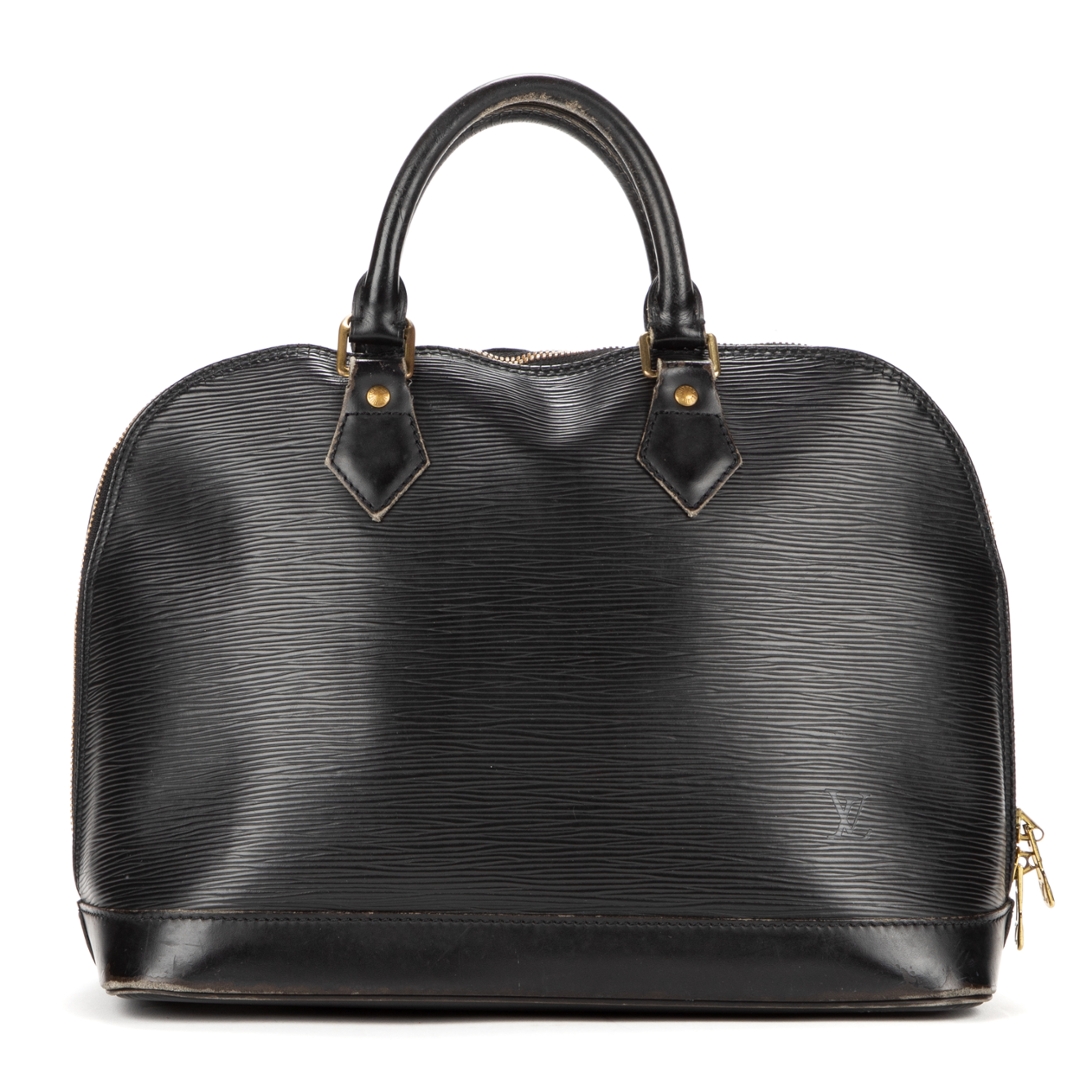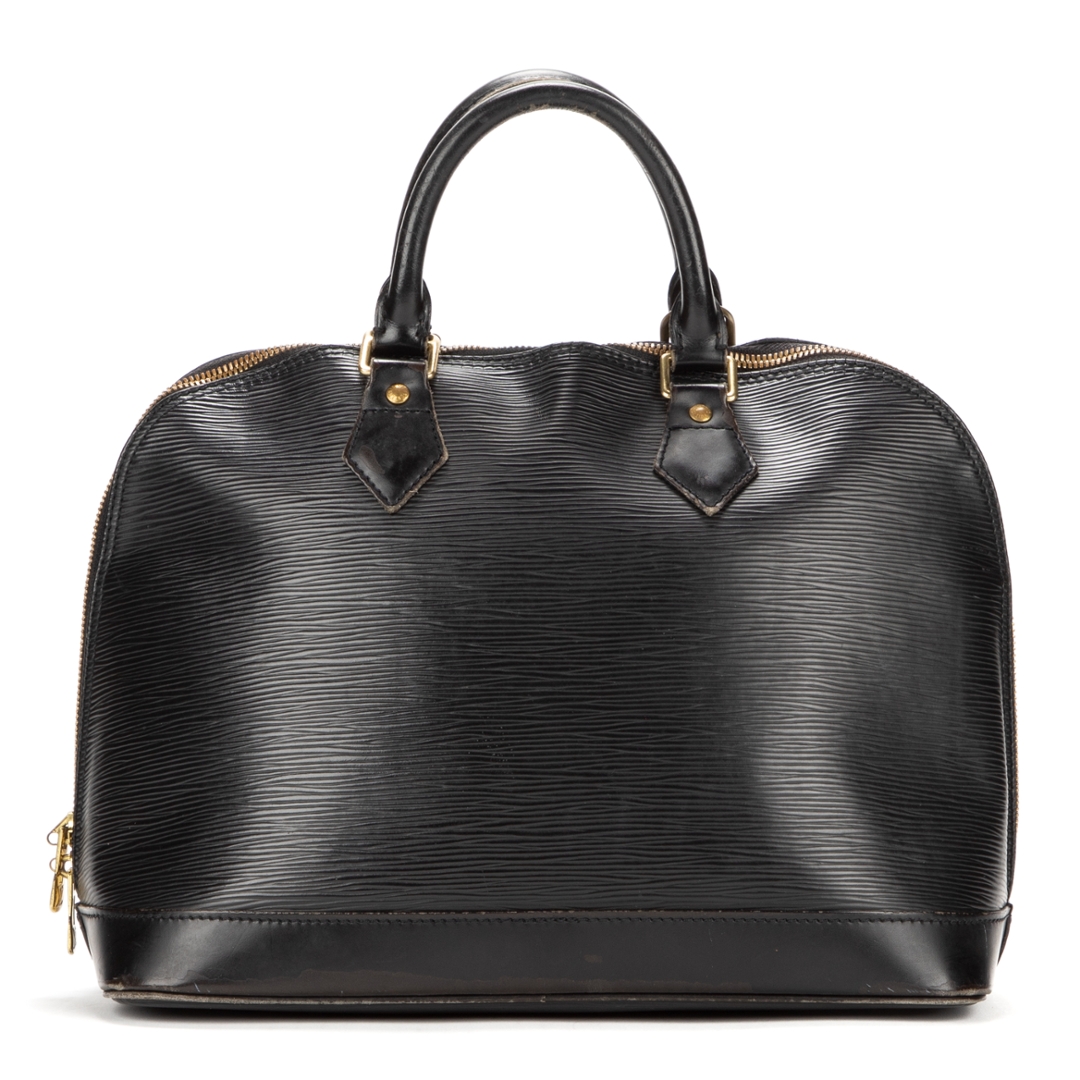 A vintage Louis Vuitton black calf leather Alma bag with a certificate of authenticity. Approximately 23cm height, 30cm width.