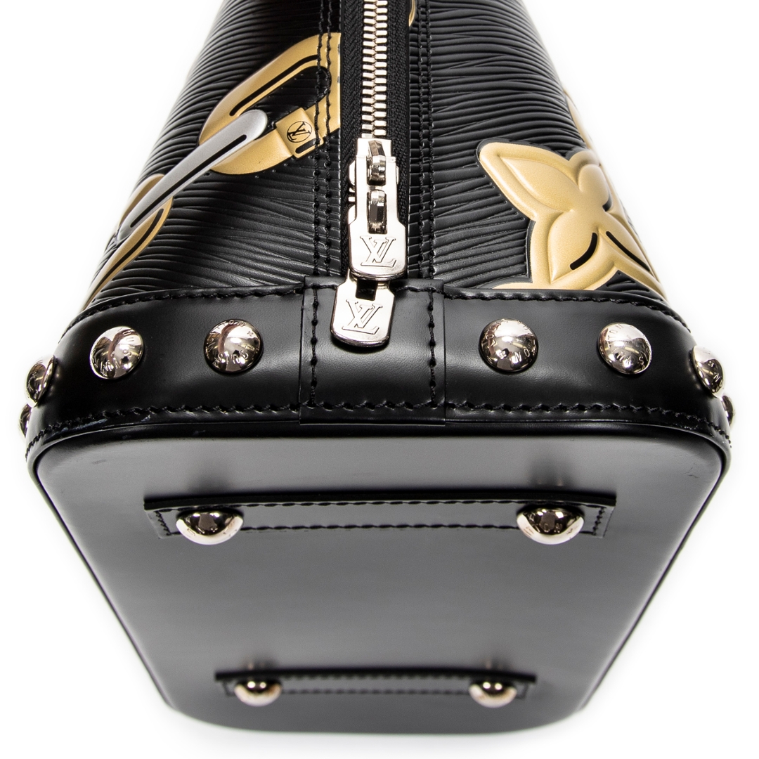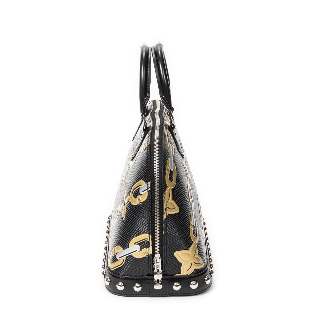 A vintage Louis Vuitton Alma bag crafted in striking black calf leather, elevated with bold gold-tone chain motif detailing that delivers a distinctive and contemporary interpretation of the house’s classic design. The textured leather exterior is complemented by structured top handles, silver-tone hardware accents, and stud detailing along the base, creating a confident and eye-catching statement piece.