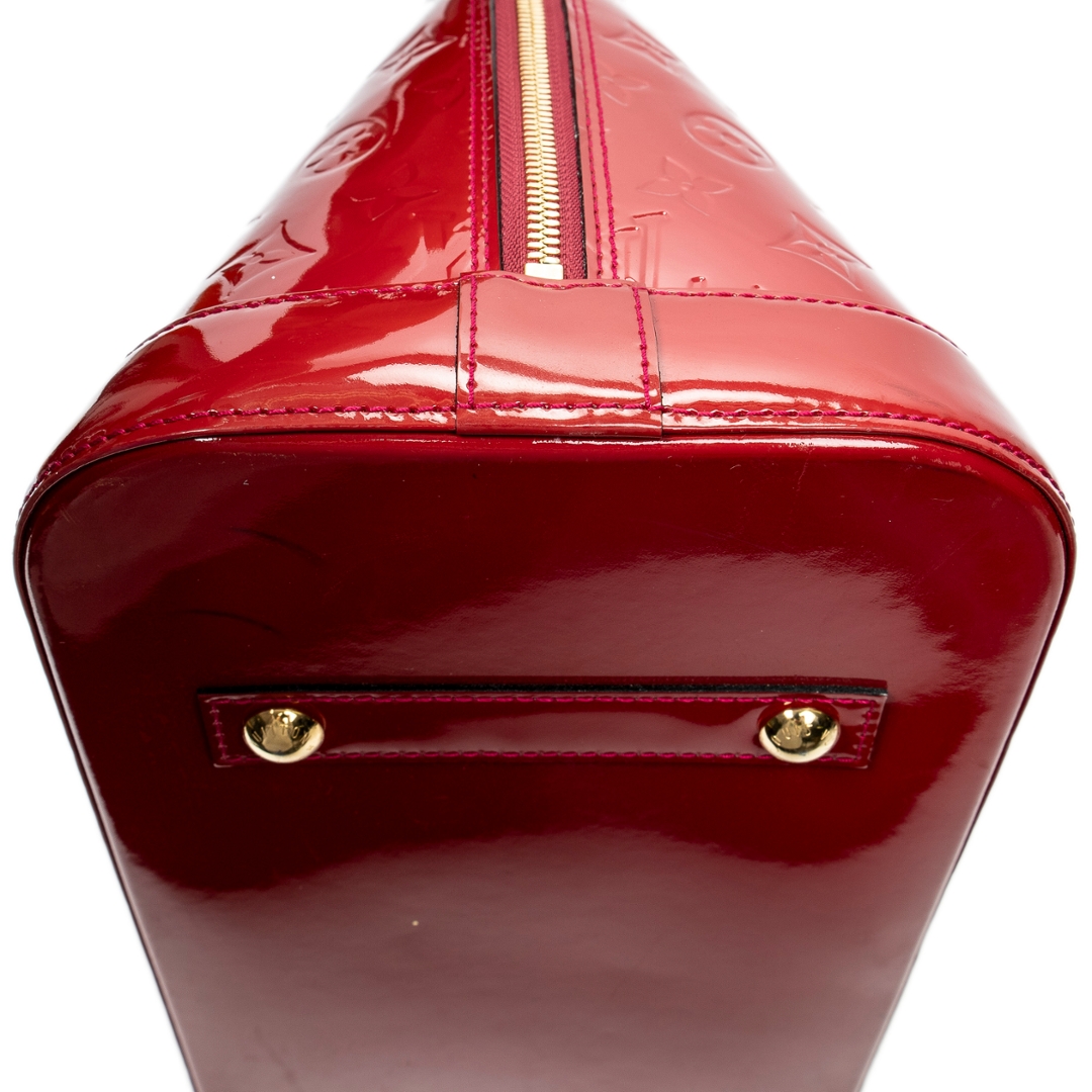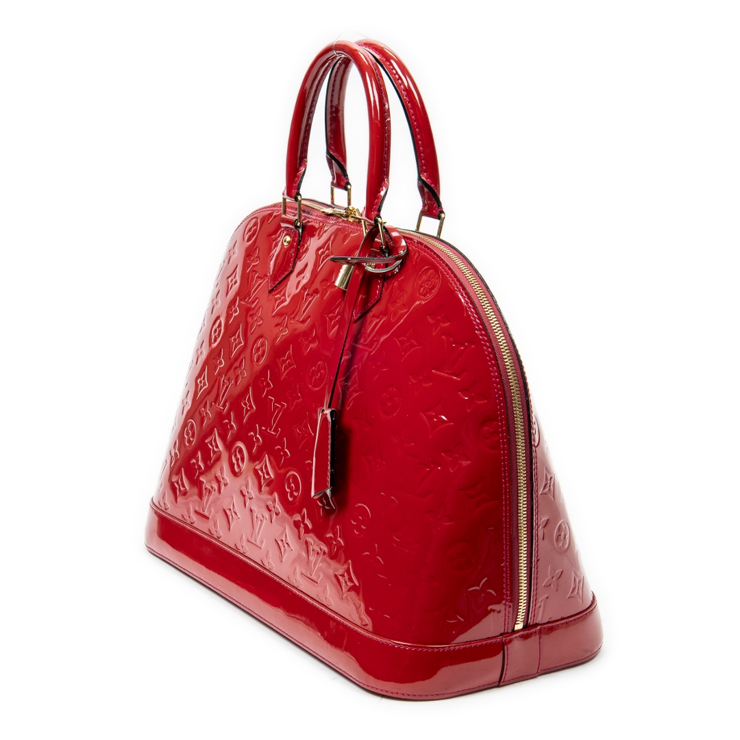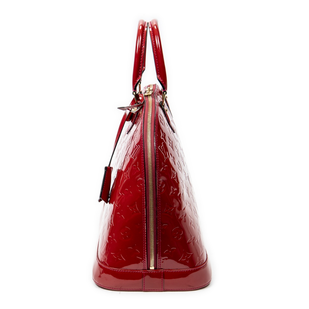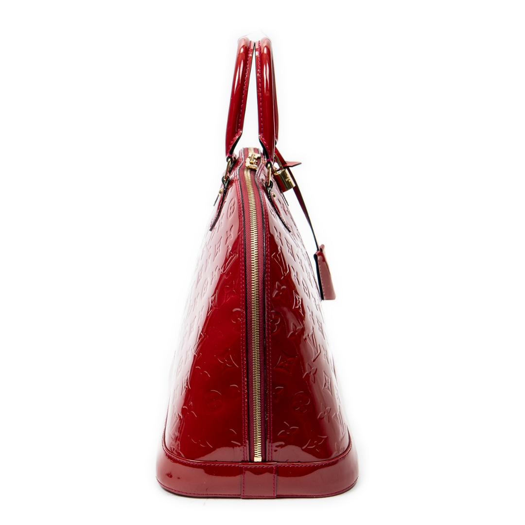 A vintage Louis Vuitton rouge greanadine calf leather Alma bag with a certificate of authenticity. Approximately 29cm height, 38cm width.