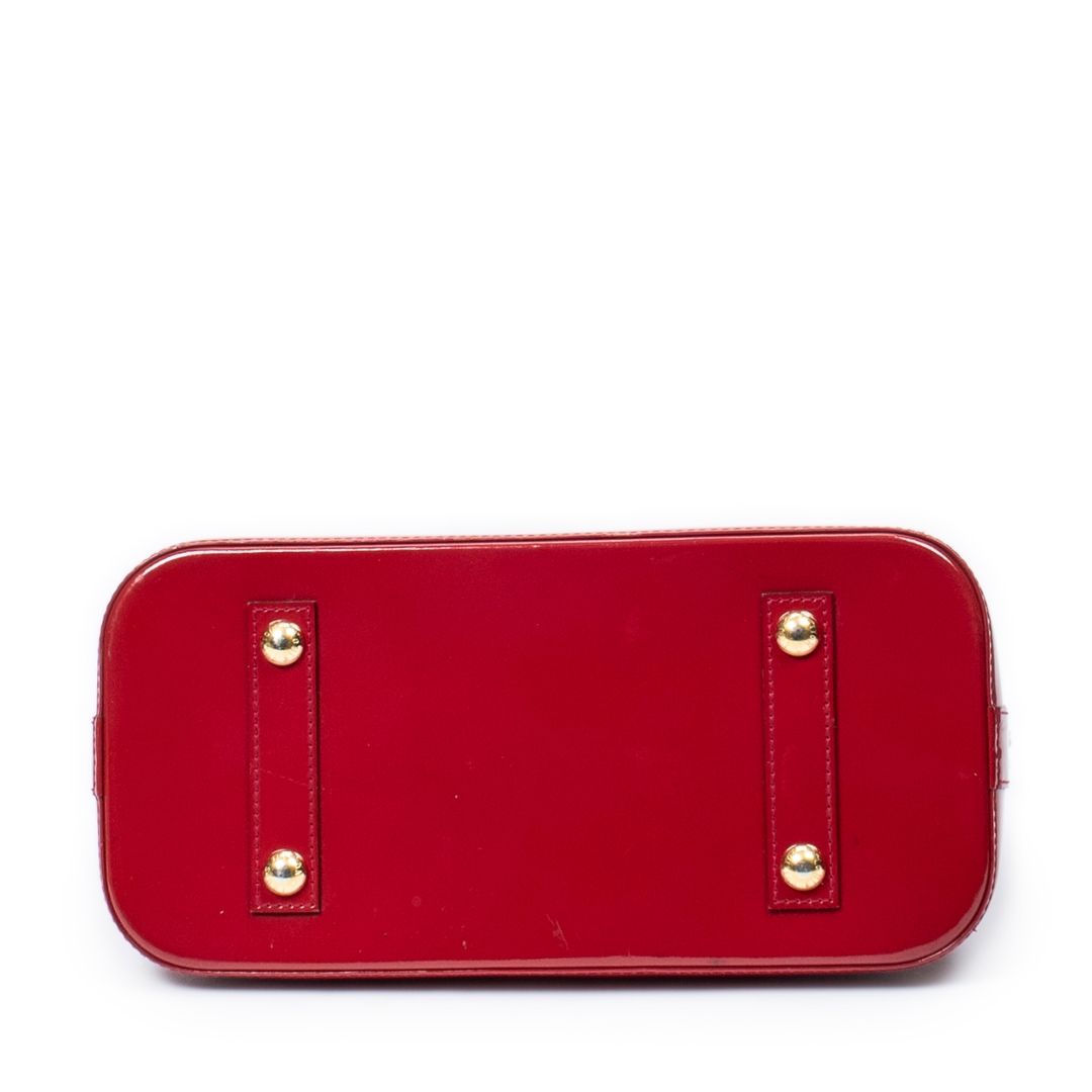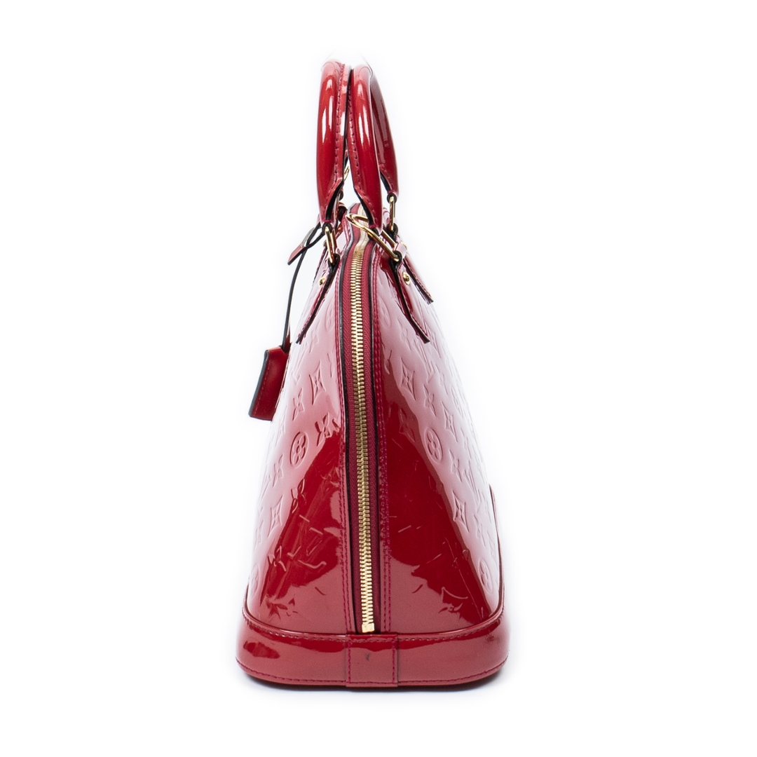 A vintage Louis Vuitton Alma bag crafted in striking Indian Rose Vernis calf leather, featuring a high-gloss finish embossed with the iconic monogram pattern. This elegant and feminine colourway enhances the classic domed silhouette, while gold-tone hardware and smooth leather detailing complete the refined, statement look.