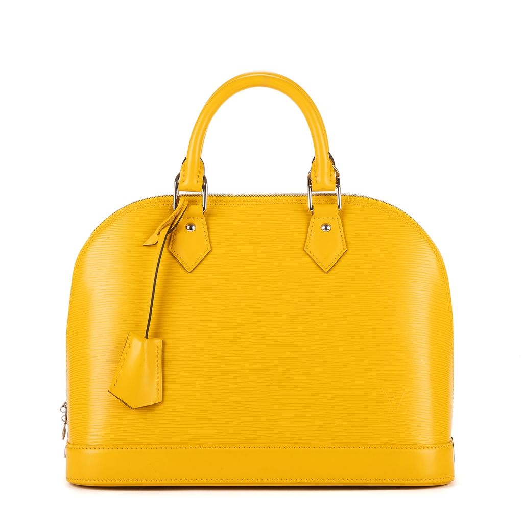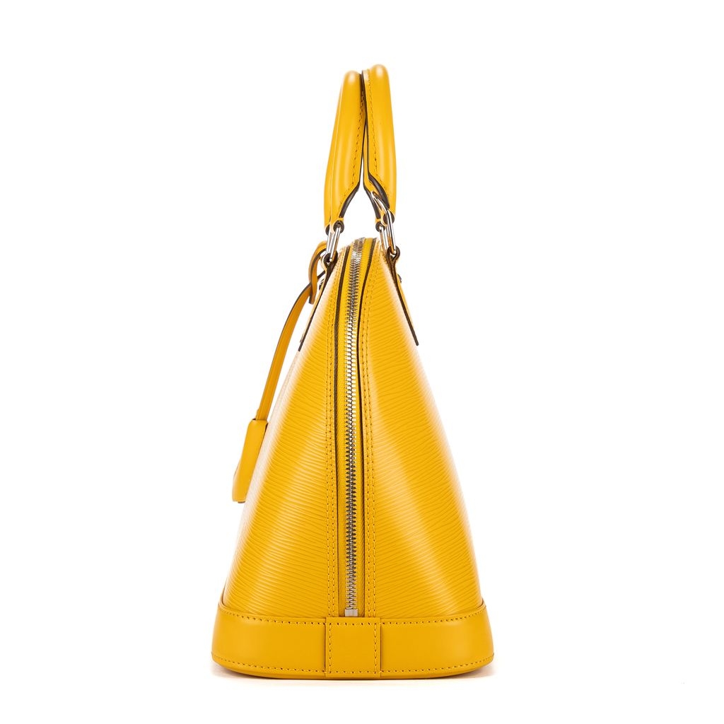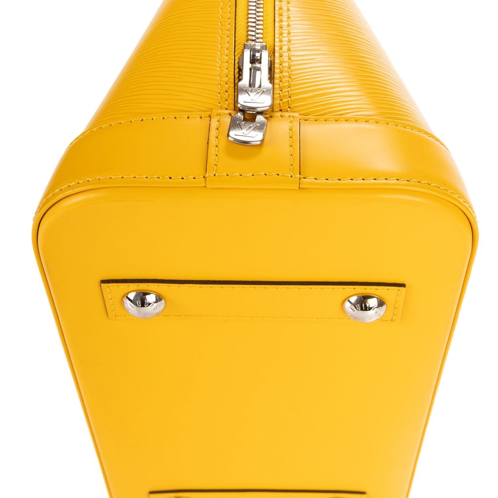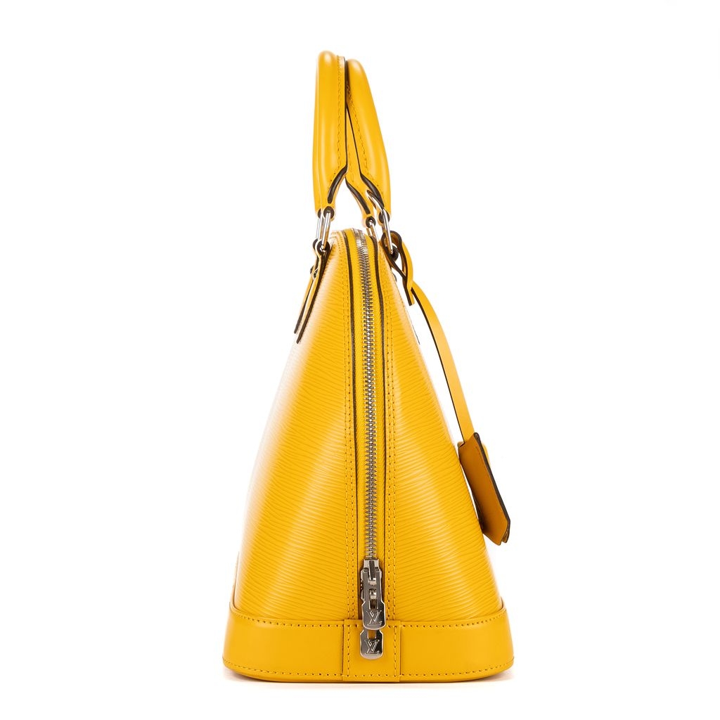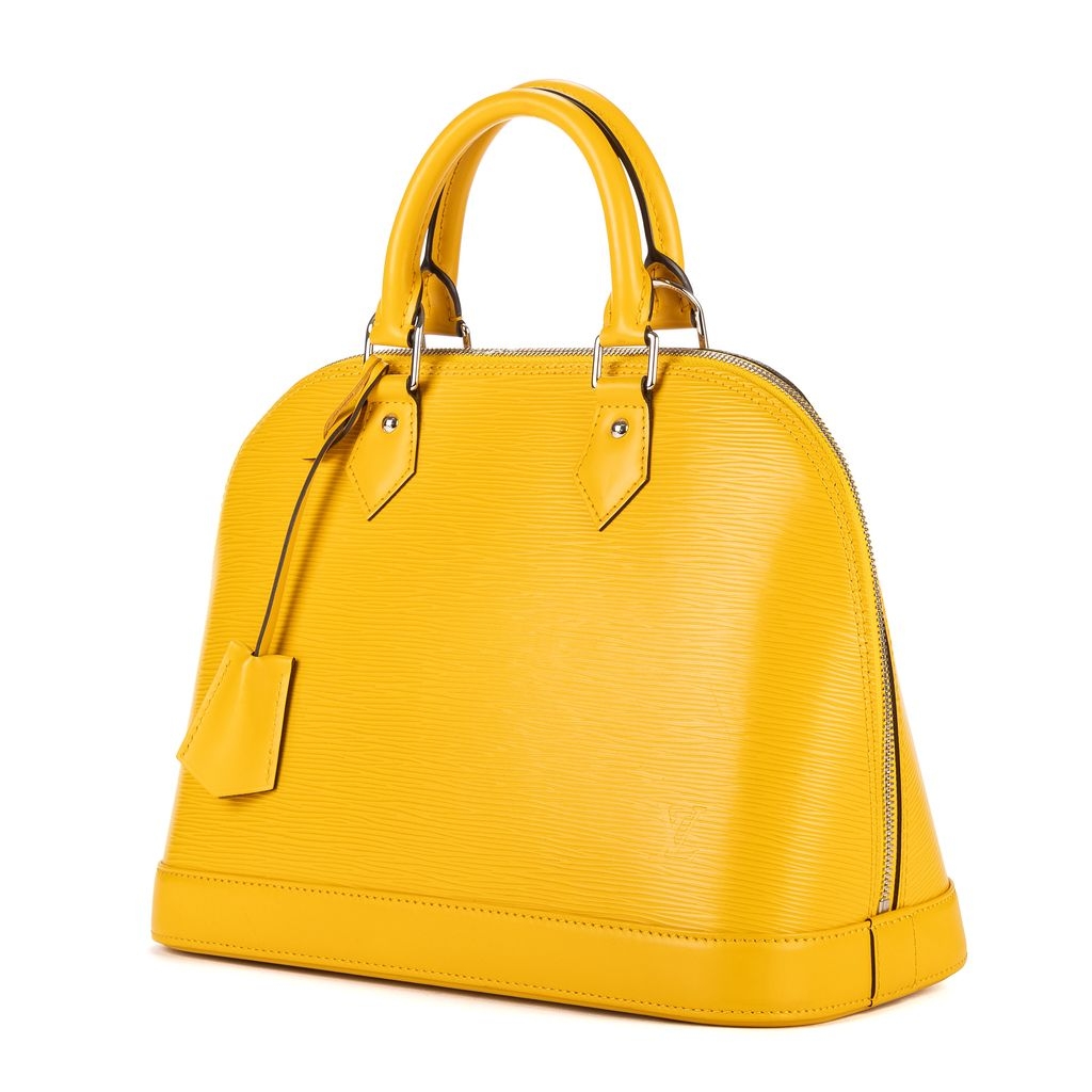 A vintage Louis Vuitton yellow calf leather Alma bag is an exquisite accessory, instantly recognisable for its iconic and structured silhouette. This beautiful piece, which includes a certificate of authenticity, is crafted from the brand's distinctive Epi leather, celebrated for its unique ribbed texture and remarkable durability. The vibrant yellow hue adds a cheerful and modern pop of colour, transforming this classic handbag into a true statement piece.