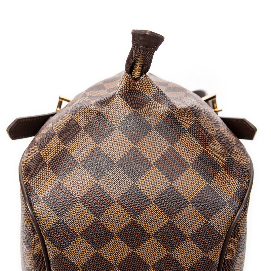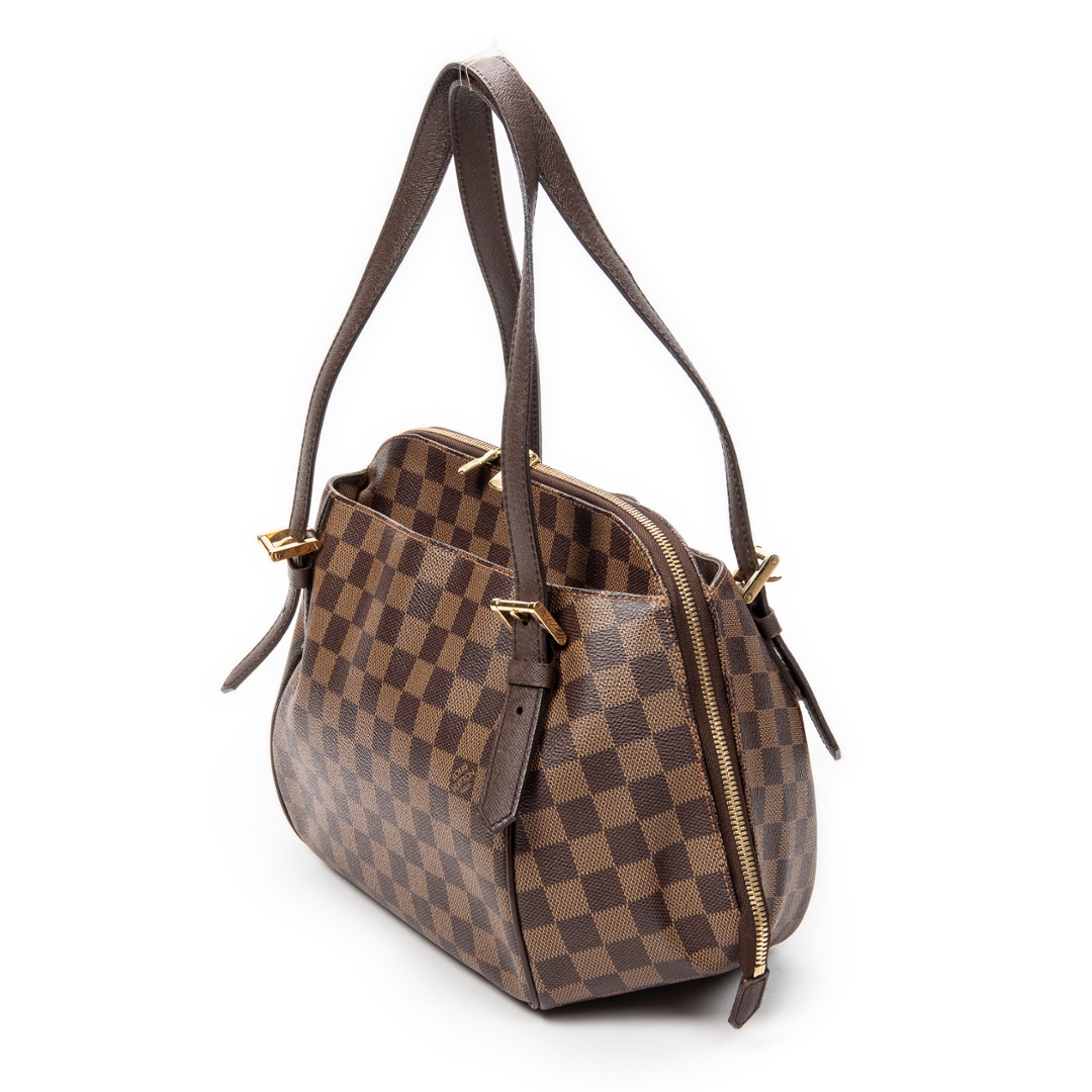 A vintage Louis Vuitton Belem bag crafted in the classic brown coated canvas with the iconic Damier Ebene pattern, complemented by dark leather trim and gold-tone hardware. The structured silhouette is defined by its clean lines and double top handles, while the full-length zip closure provides both security and a refined finish.