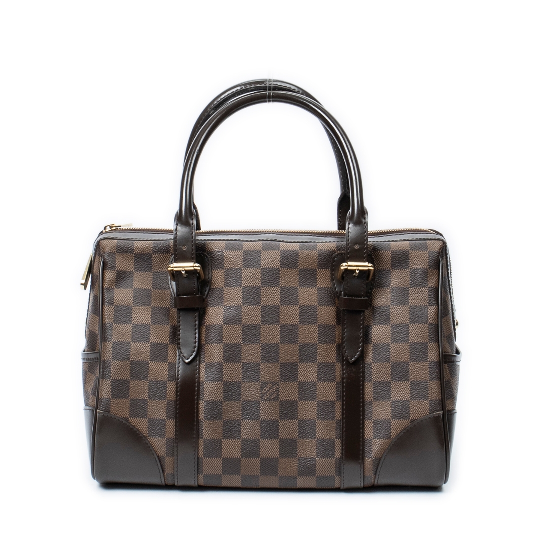 A vintage Louis Vuitton Berkeley bag crafted in the signature brown coated canvas with the iconic Damier Ebene pattern, elevated by smooth dark leather trim and gold-tone hardware. The structured silhouette is defined by its elegant top handles and distinctive front plaque, creating a refined and instantly recognisable Louis Vuitton aesthetic.