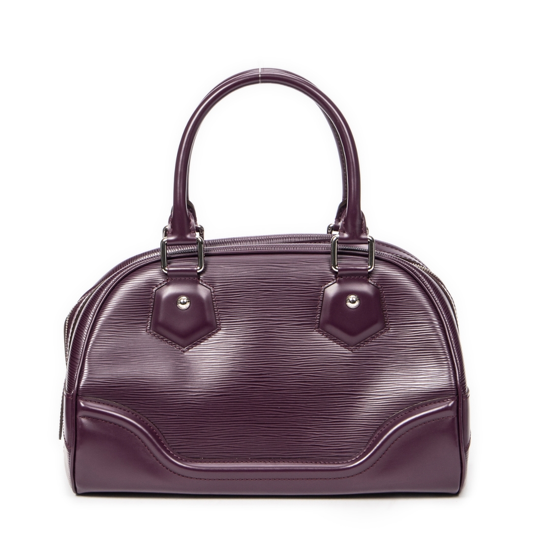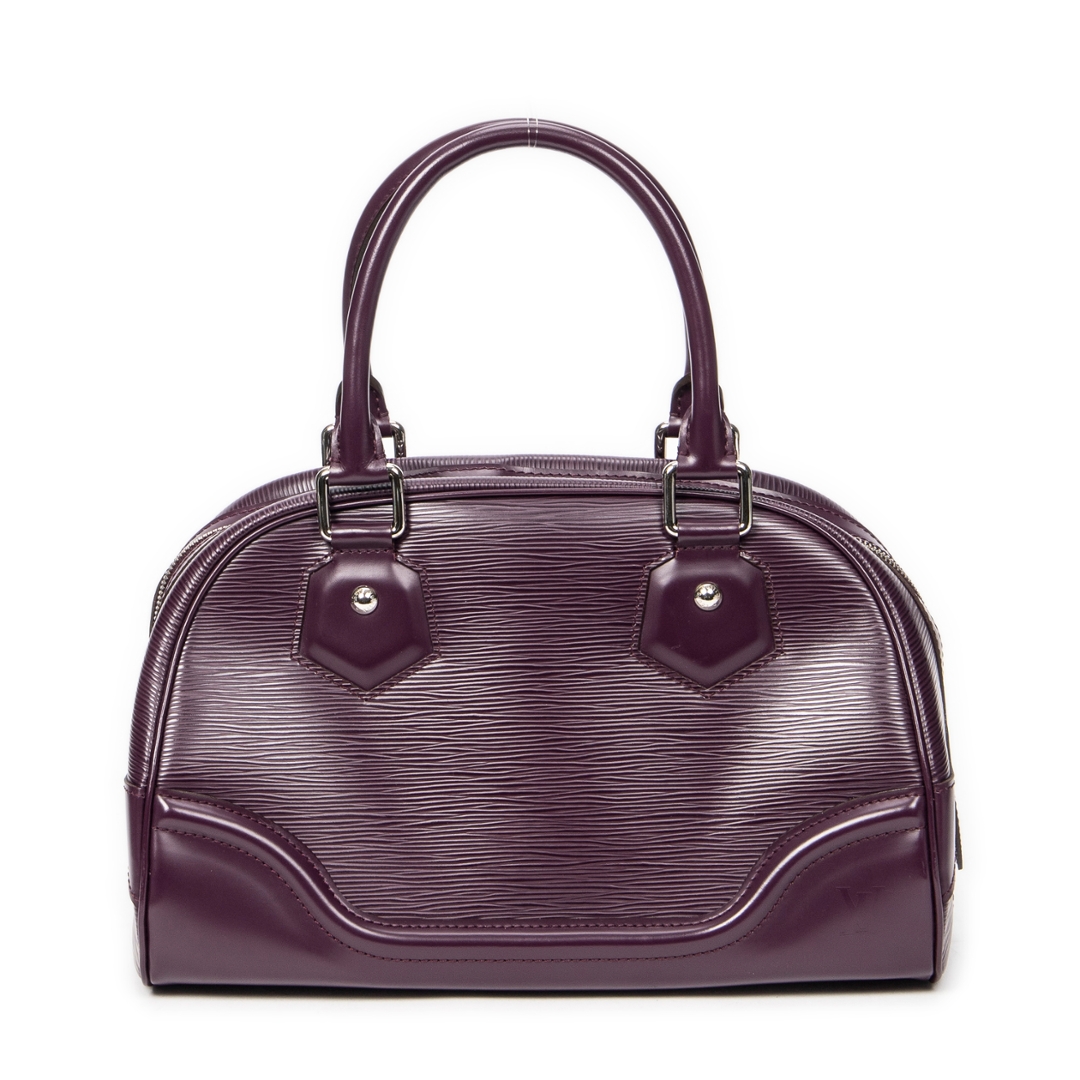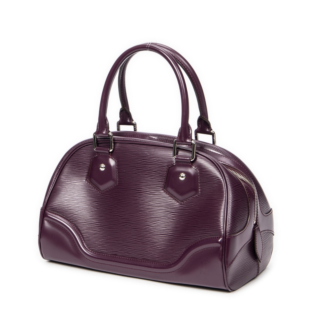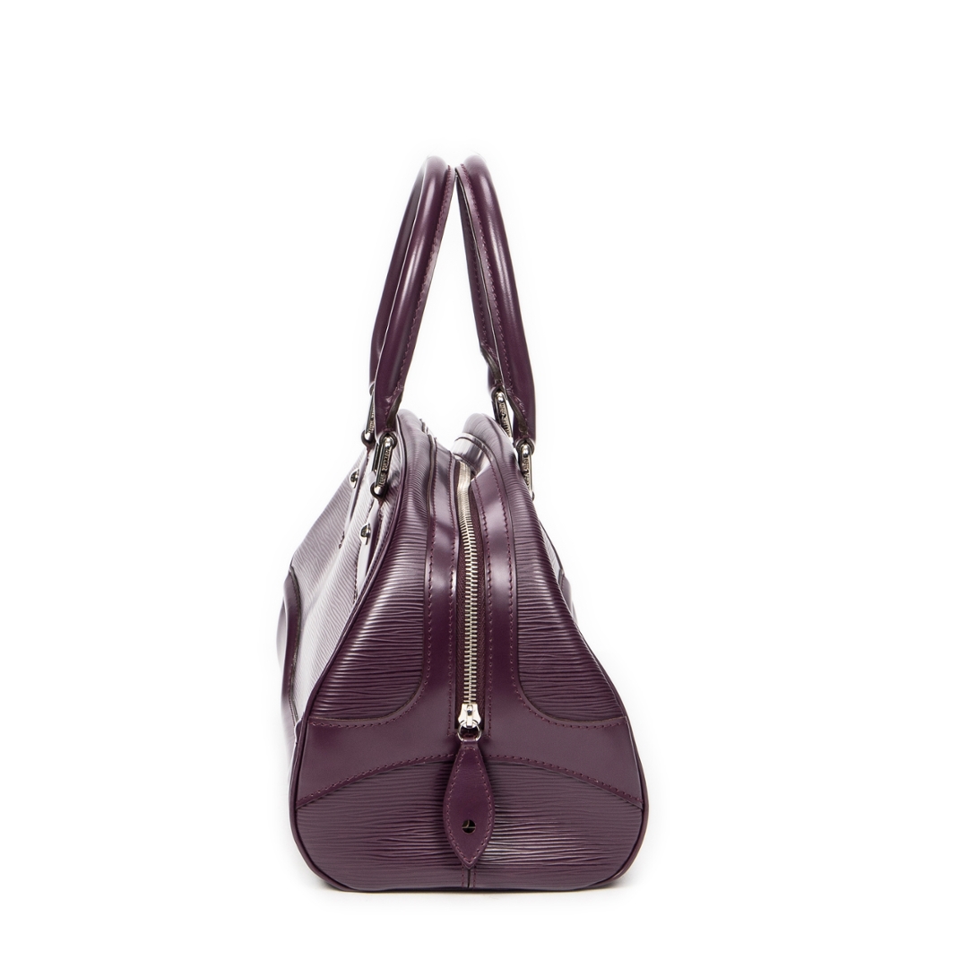 A vintage Louis Vuitton purple magenta calf leather Bowling Montaigne bag with a certificate of authenticity. Approximately 20cm height, 32cm width.