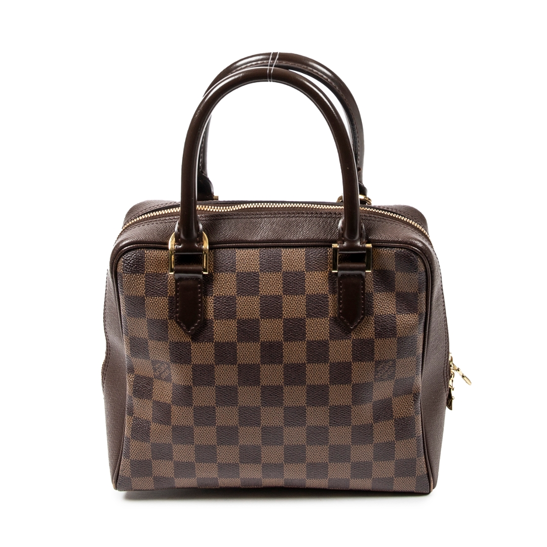 A vintage Louis Vuitton Brera bag crafted in the house’s signature brown Damier coated canvas, offering a compact and structured silhouette with timeless appeal. The refined rectangular shape is complemented by dark leather trim, dual rolled top handles, and gold-tone hardware, while the secure double zip closure ensures practicality for everyday use. Measuring approximately 20cm in height and 24cm in width, it presents a neat and versatile size ideal for daily essentials.