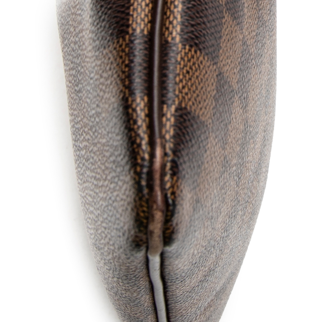 A vintage Louis Vuitton Brooklyn Pochette Plate bag crafted in the house’s signature brown Damier coated canvas, offering a clean and contemporary silhouette with everyday practicality. The compact square profile is complemented by a wide adjustable shoulder strap, dark leather trim, and gold-tone hardware, while a secure zip-top closure ensures ease of use. Measuring approximately 25cm in height and 25cm in width, it provides a balanced and versatile size for daily essentials.