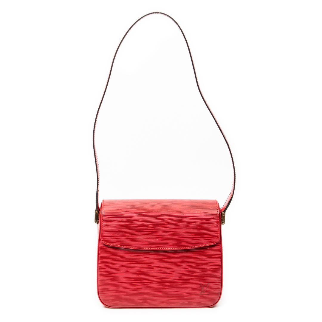 A vintage Louis Vuitton Red Calf Leather Buci bag with a certificate of authenticity. Approximately 16cm height, 20cm width.