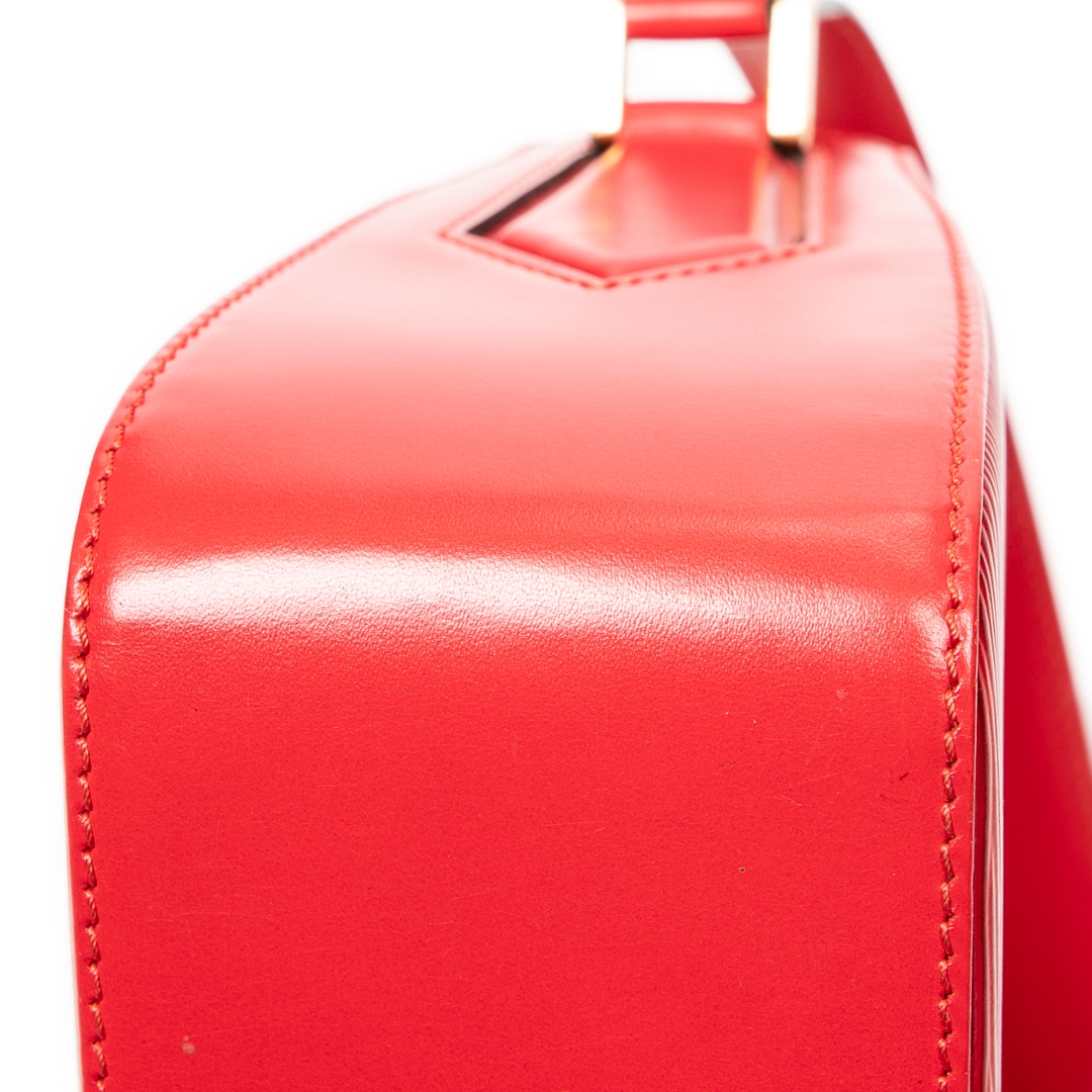 A vintage Louis Vuitton Buci bag crafted in striking red calf leather, featuring the signature textured finish that adds depth and a refined tactile quality. The compact, structured silhouette is complemented by smooth leather side panels and subtle gold-tone hardware, creating a bold yet elegant statement piece within the Louis Vuitton collection.