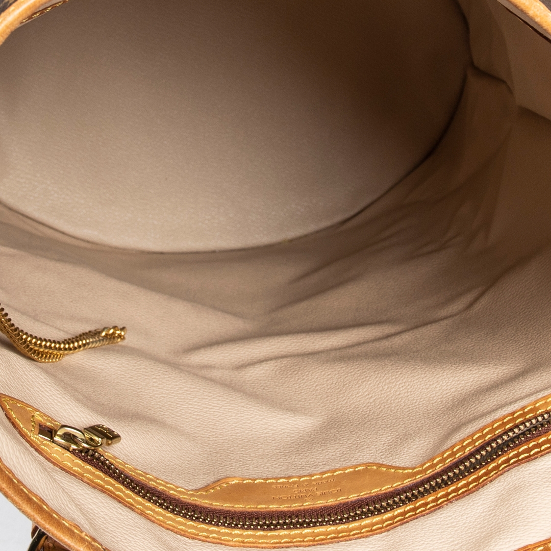 A vintage Louis Vuitton Bucket bag crafted in the house’s iconic brown Monogram coated canvas, offering a distinctive and practical silhouette with timeless appeal. The structured cylindrical shape is complemented by natural leather trim, adjustable shoulder straps with buckle detailing, and gold-tone hardware, creating a balanced and functional design. Measuring approximately 36cm in height and 27cm in width, it provides a tall and spacious profile ideal for everyday use.
