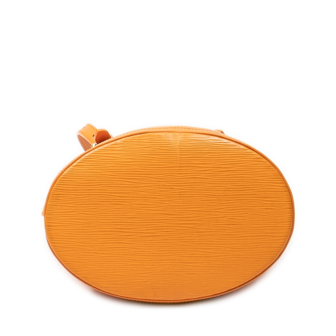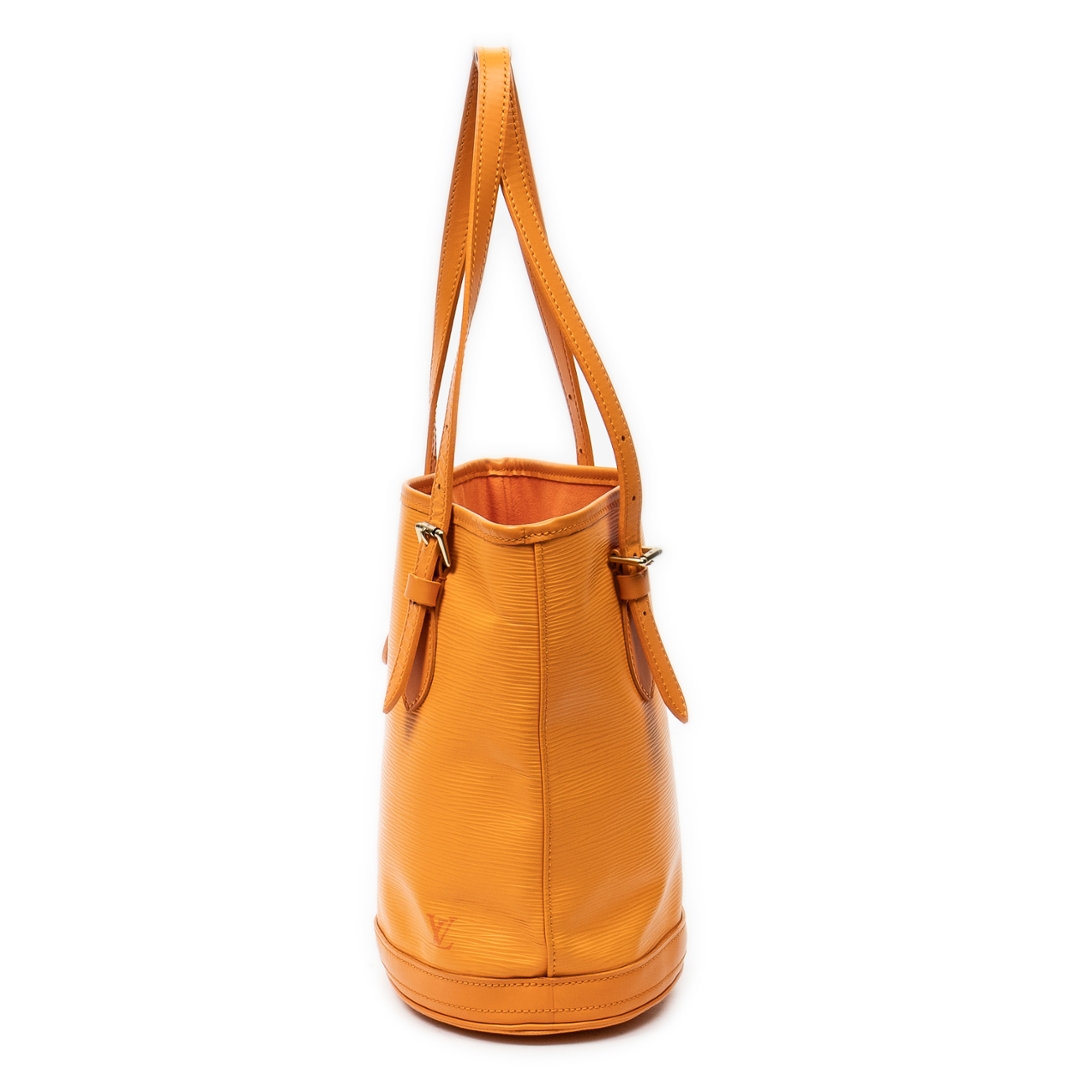 A vintage Louis Vuitton Mandarin Orange Calf Leather Bucket bag with a certificate of authenticity. Approximately 25cm height, 23cm width.