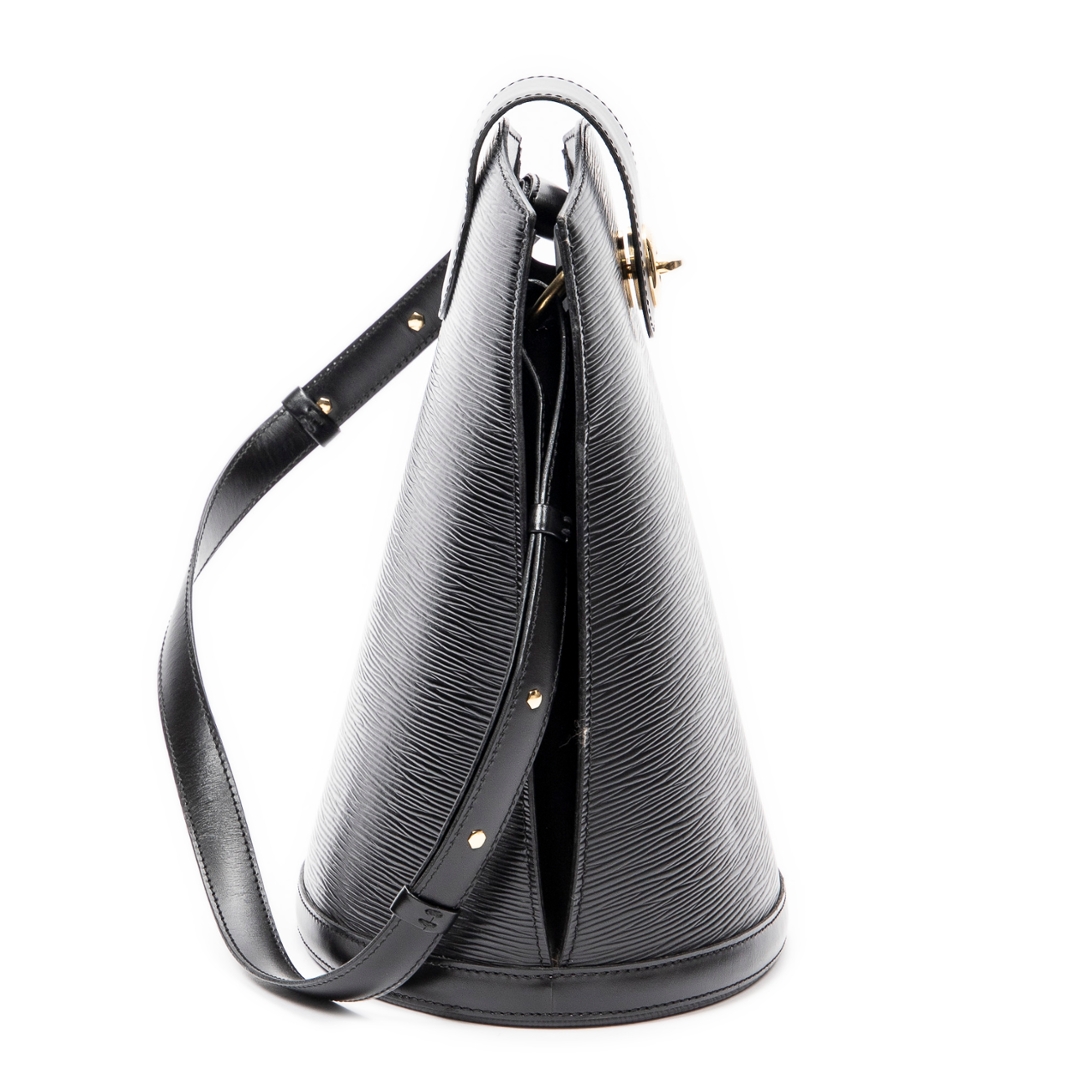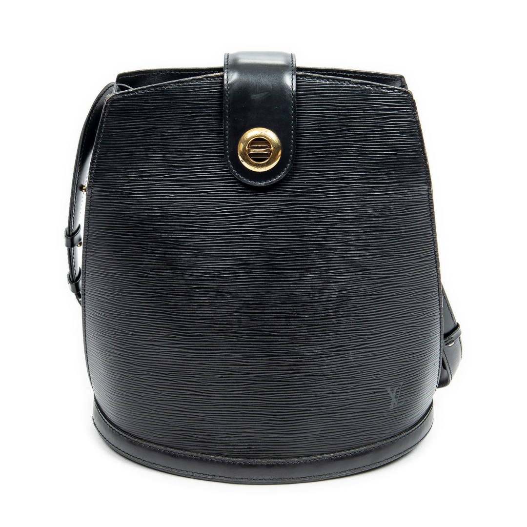 A vintage Louis Vuitton Cluny bag crafted from black calf leather, featuring the brand’s signature textured finish and a structured bucket-style silhouette. The elegant design is complemented by a distinctive top flap with a gold-tone turn-lock closure, creating a refined and timeless aesthetic suited to both day and evening wear.