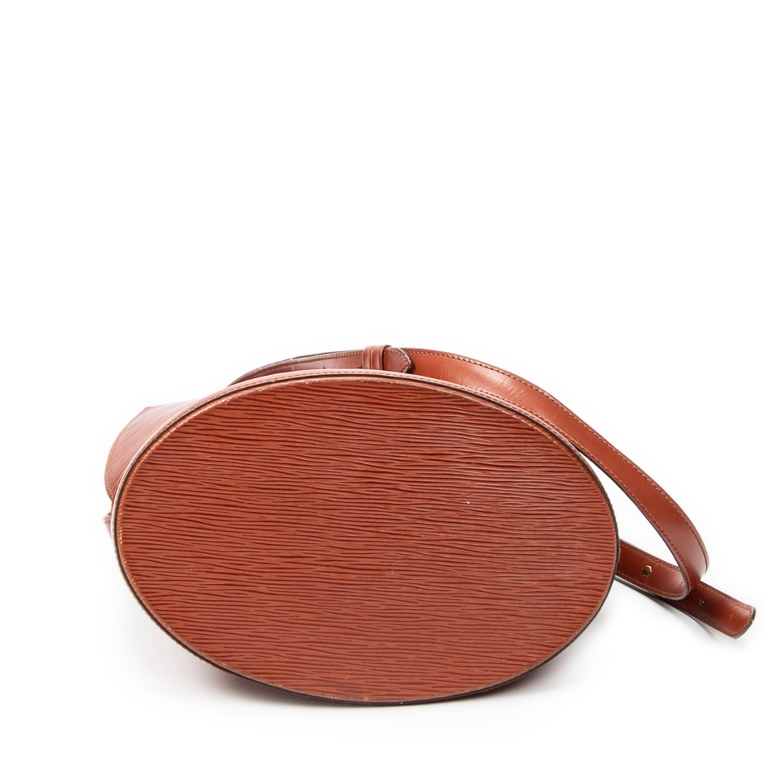 A vintage Louis Vuitton Cluny bag crafted in rich tan Epi calf leather, offering a structured and timeless silhouette that reflects classic Parisian design. The elegant upright shape is complemented by a top handle and a signature front flap with gold-tone turn-lock closure, creating a refined and secure everyday piece. Measuring approximately 30cm in height and 26cm in width, it provides a practical size while maintaining a sleek profile.