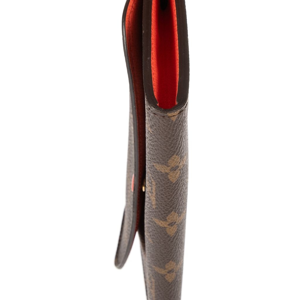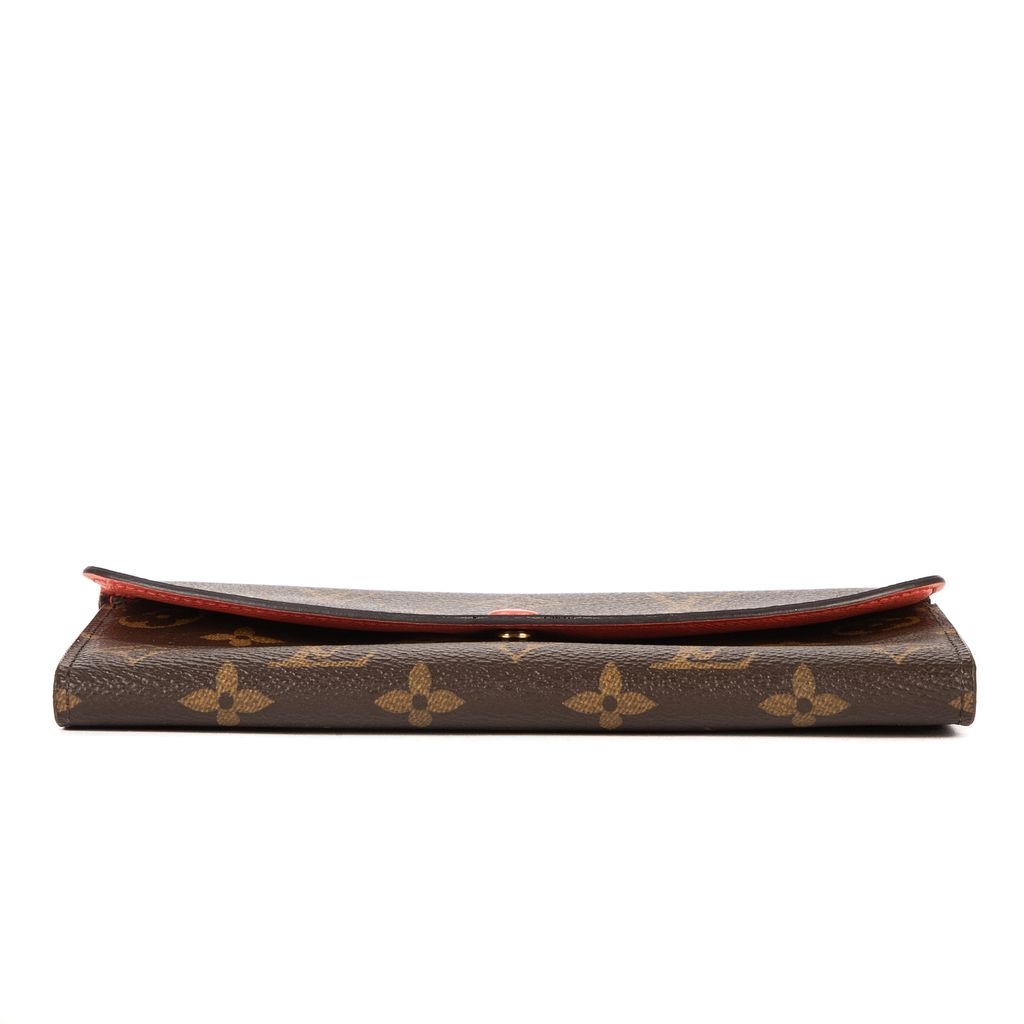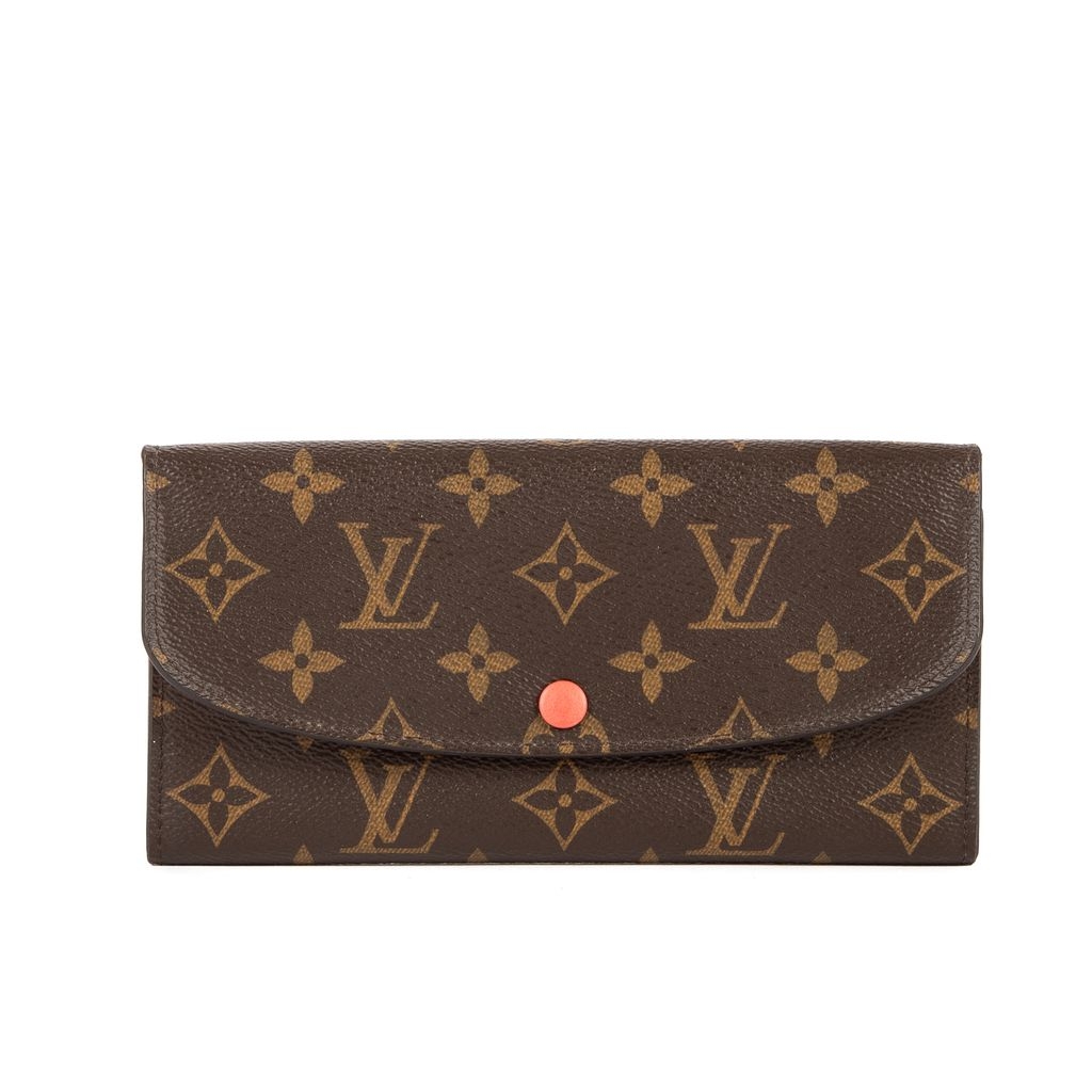 A vintage Louis Vuitton monogram coated canvas Emilie wallet with a certificate of authenticity, measuring approximately 5cm in height and 19cm in width. This elegant wallet showcases the maison’s iconic monogram canvas exterior, paired with a vibrant red interior that adds a refined pop of colour. The envelope-style flap is secured with a press-stud closure, highlighted by a matching red button for a cohesive and stylish finish.