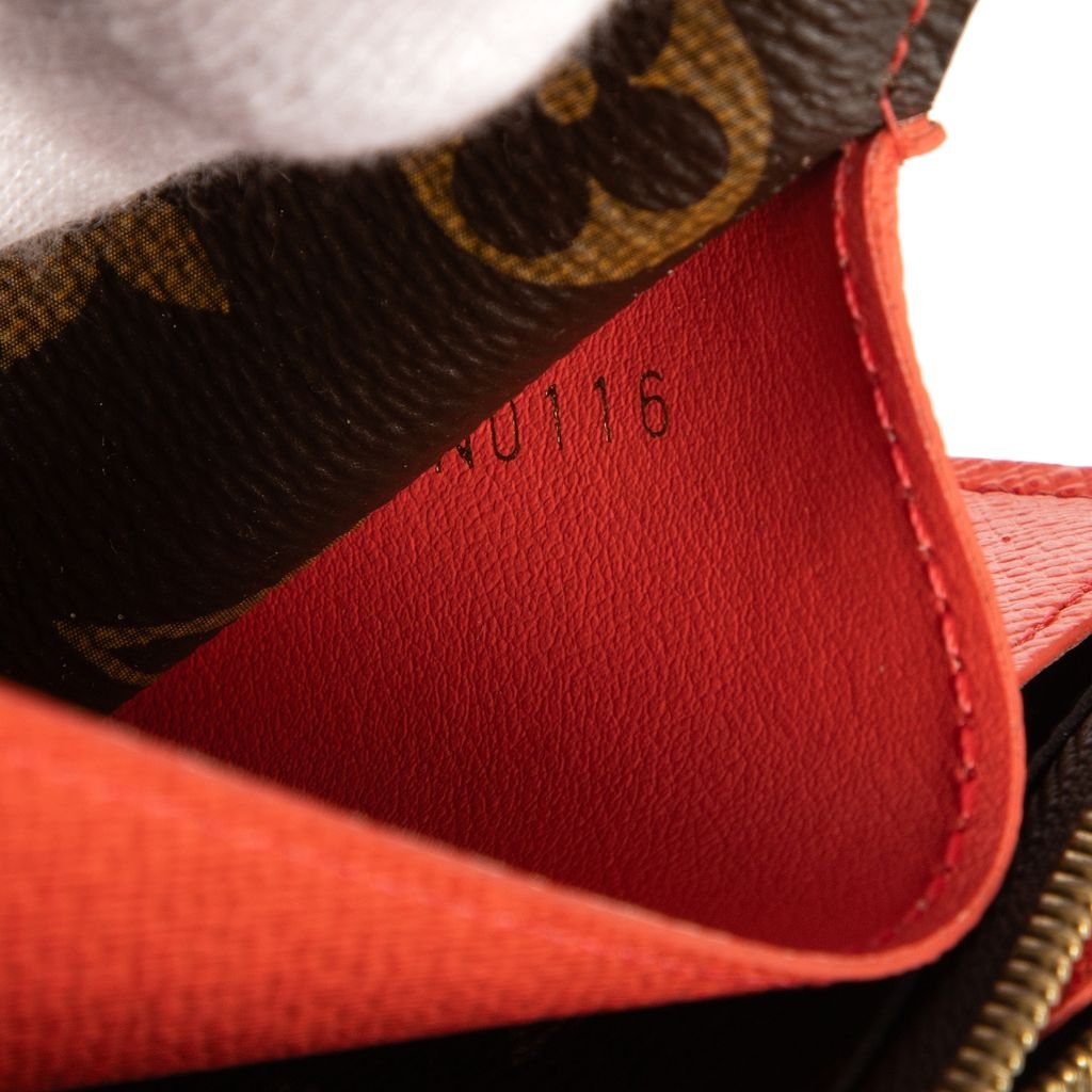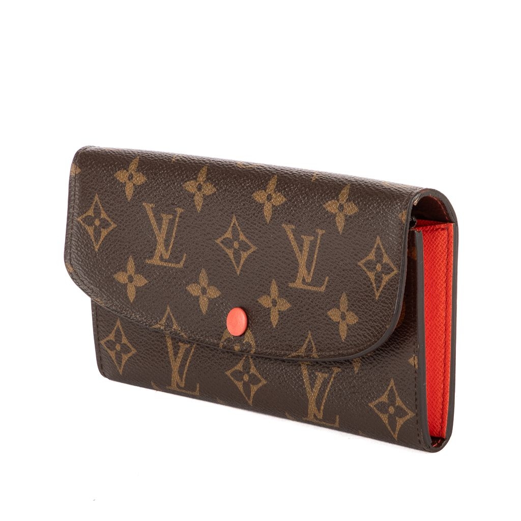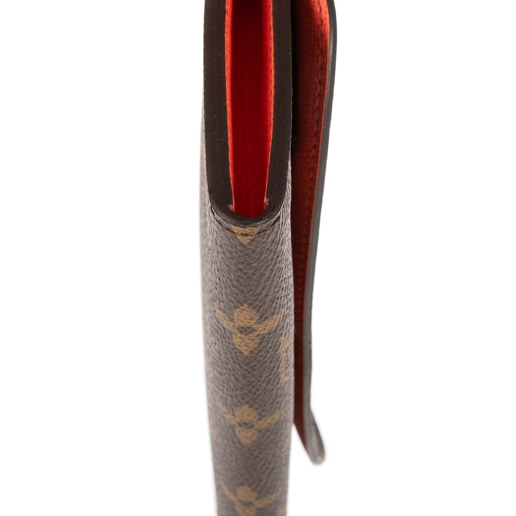 A vintage Louis Vuitton monogram coated canvas Emilie wallet with a certificate of authenticity, measuring approximately 5cm in height and 19cm in width. This elegant wallet showcases the maison’s iconic monogram canvas exterior, paired with a vibrant red interior that adds a refined pop of colour. The envelope-style flap is secured with a press-stud closure, highlighted by a matching red button for a cohesive and stylish finish.