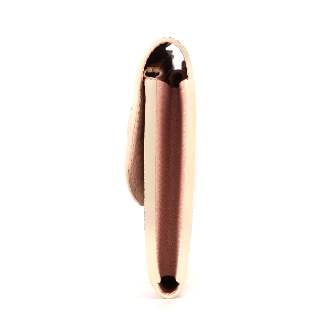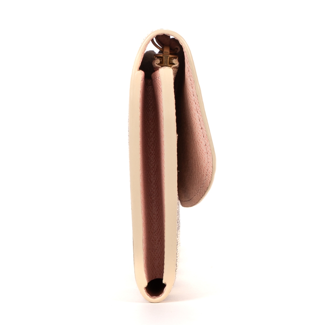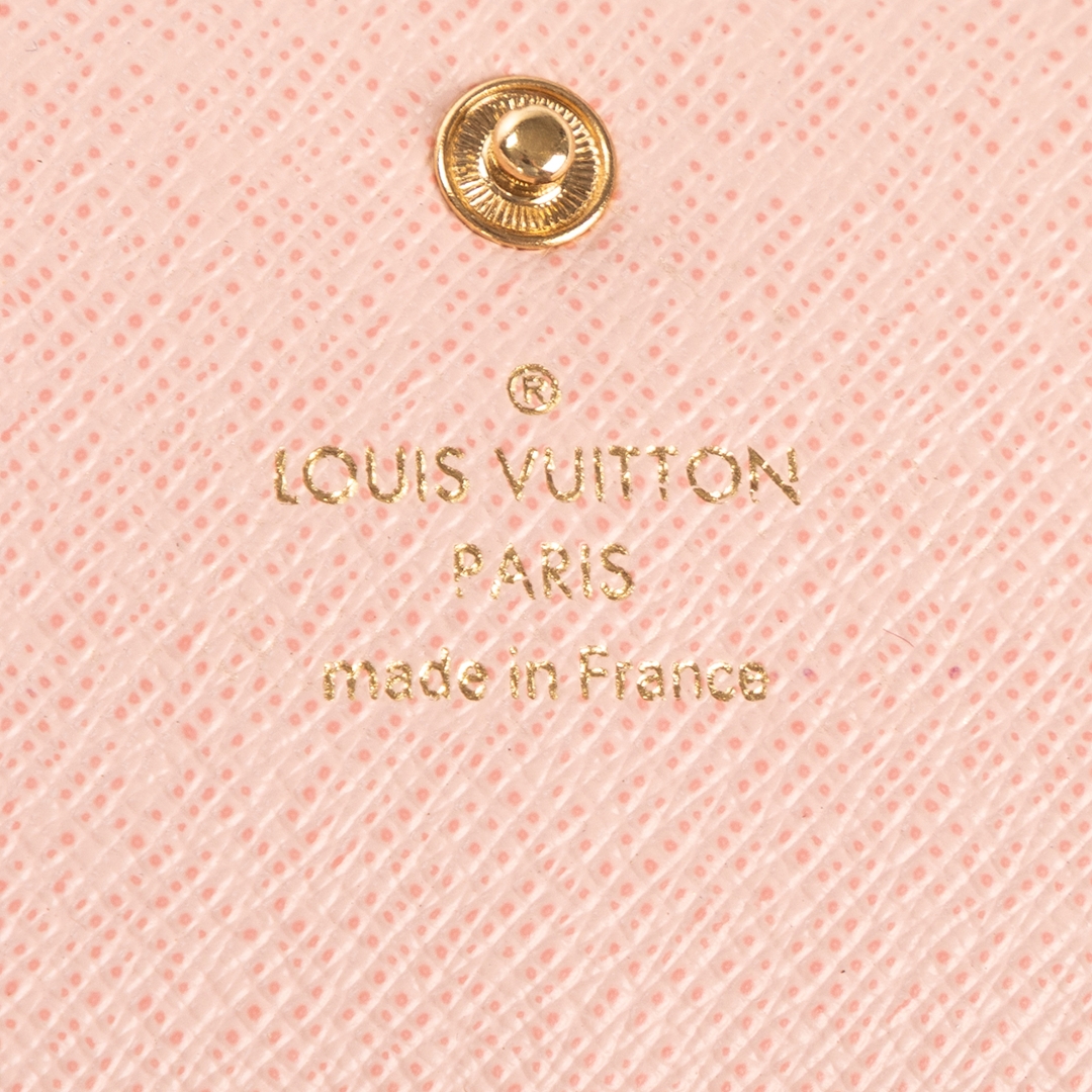 The exterior is finished with a curved flap closure and signature press-stud fastening, complemented by subtle Louis Vuitton branding and a soft-toned interior accent. Designed with functionality in mind, the wallet opens to reveal multiple compartments for cards, notes, and essentials, ensuring organised storage within a slim silhouette. Its coated canvas construction provides durability while retaining its lightweight feel.