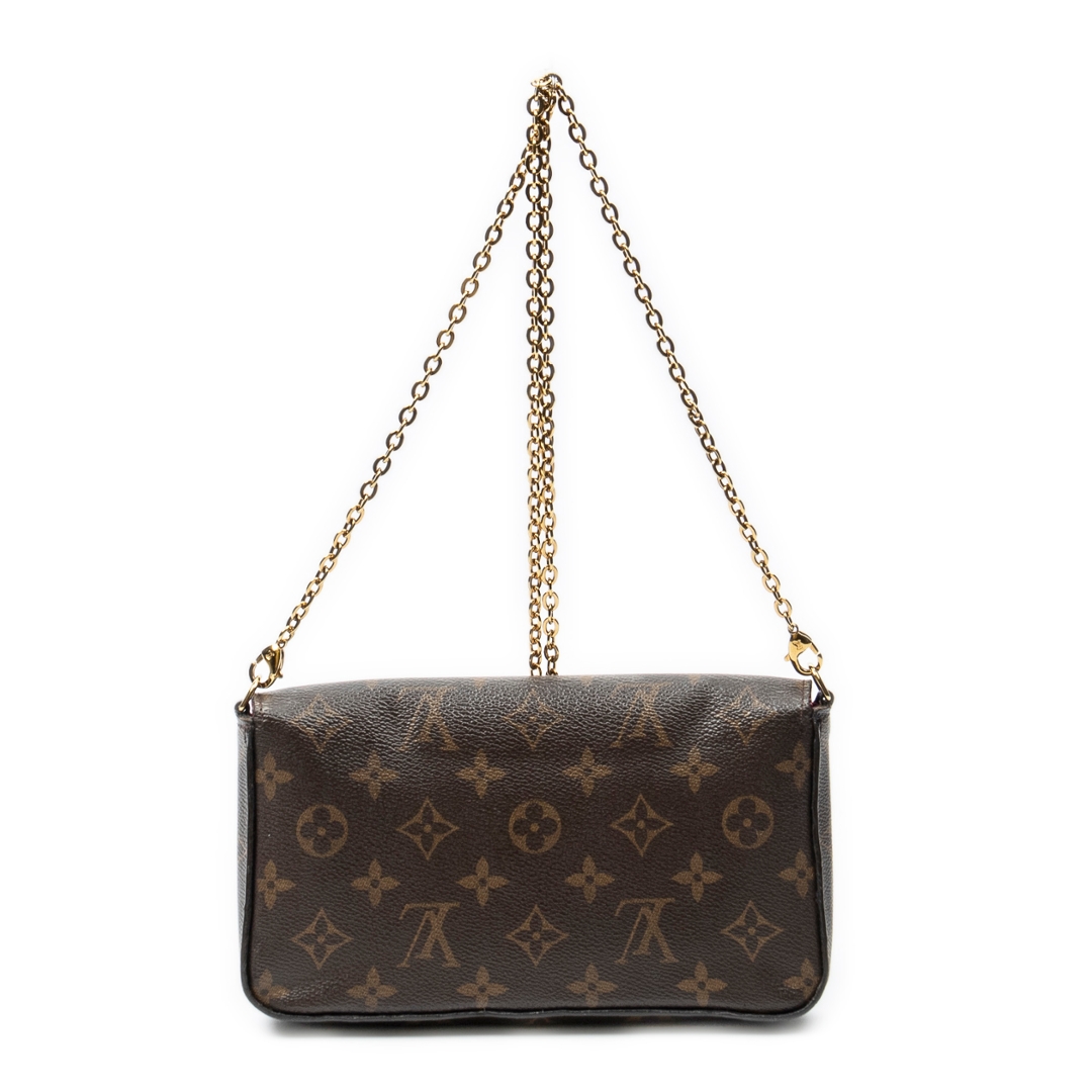 A vintage Louis Vuitton Félicie Pochette bag crafted in the iconic brown coated canvas, showcasing the signature monogram pattern with a sleek envelope-style silhouette. Finished with gold-tone hardware and a detachable chain strap, this refined piece offers both elegance and versatility within a compact design.