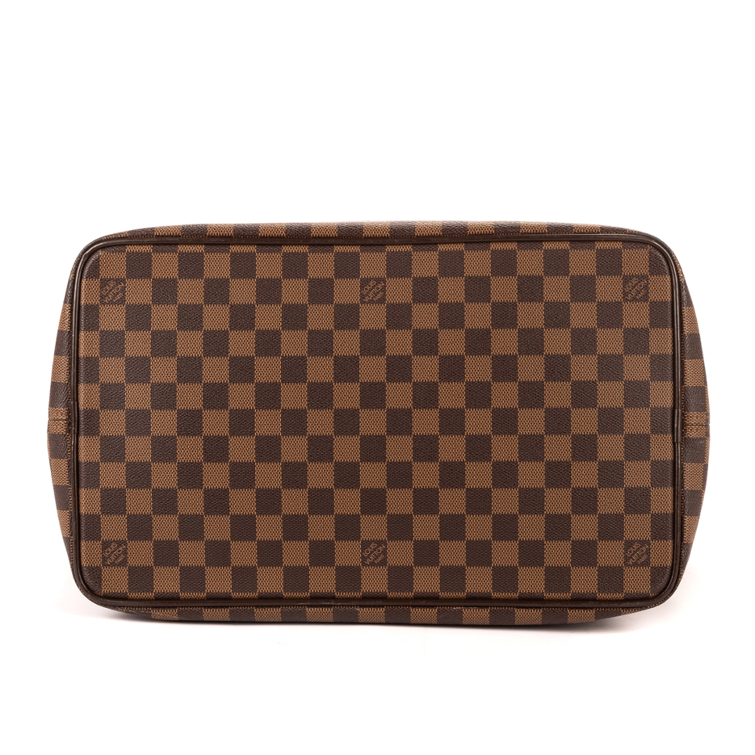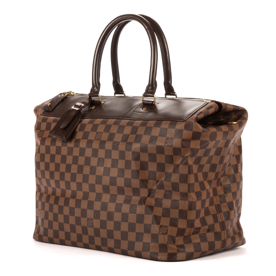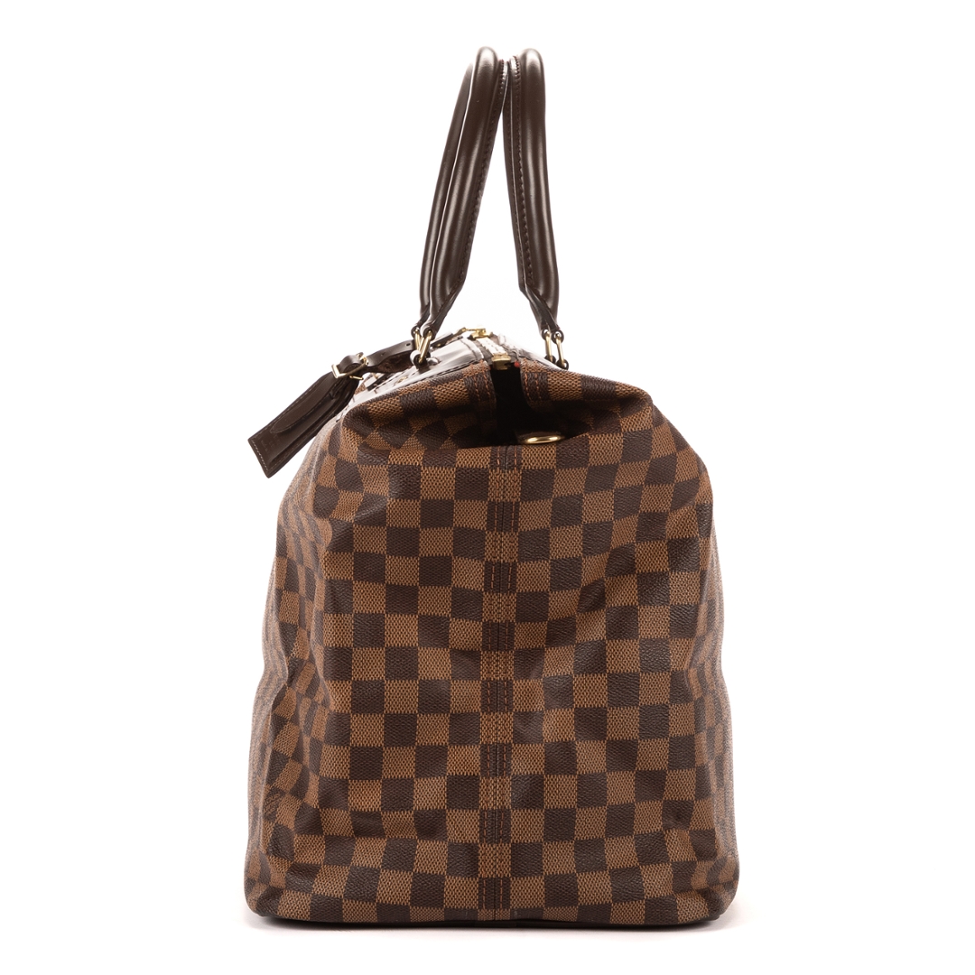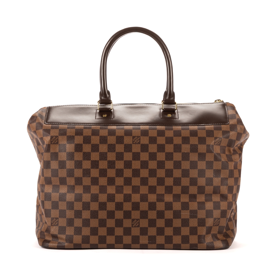 A vintage Louis Vuitton Greenwich bag crafted in the iconic brown Damier Ebene coated canvas, presenting a timeless and highly recognisable aesthetic. The structured silhouette is enhanced by rich leather trim, rolled top handles, and refined gold-tone hardware, creating a sophisticated piece that reflects the enduring appeal of Louis Vuitton’s travel-inspired heritage.