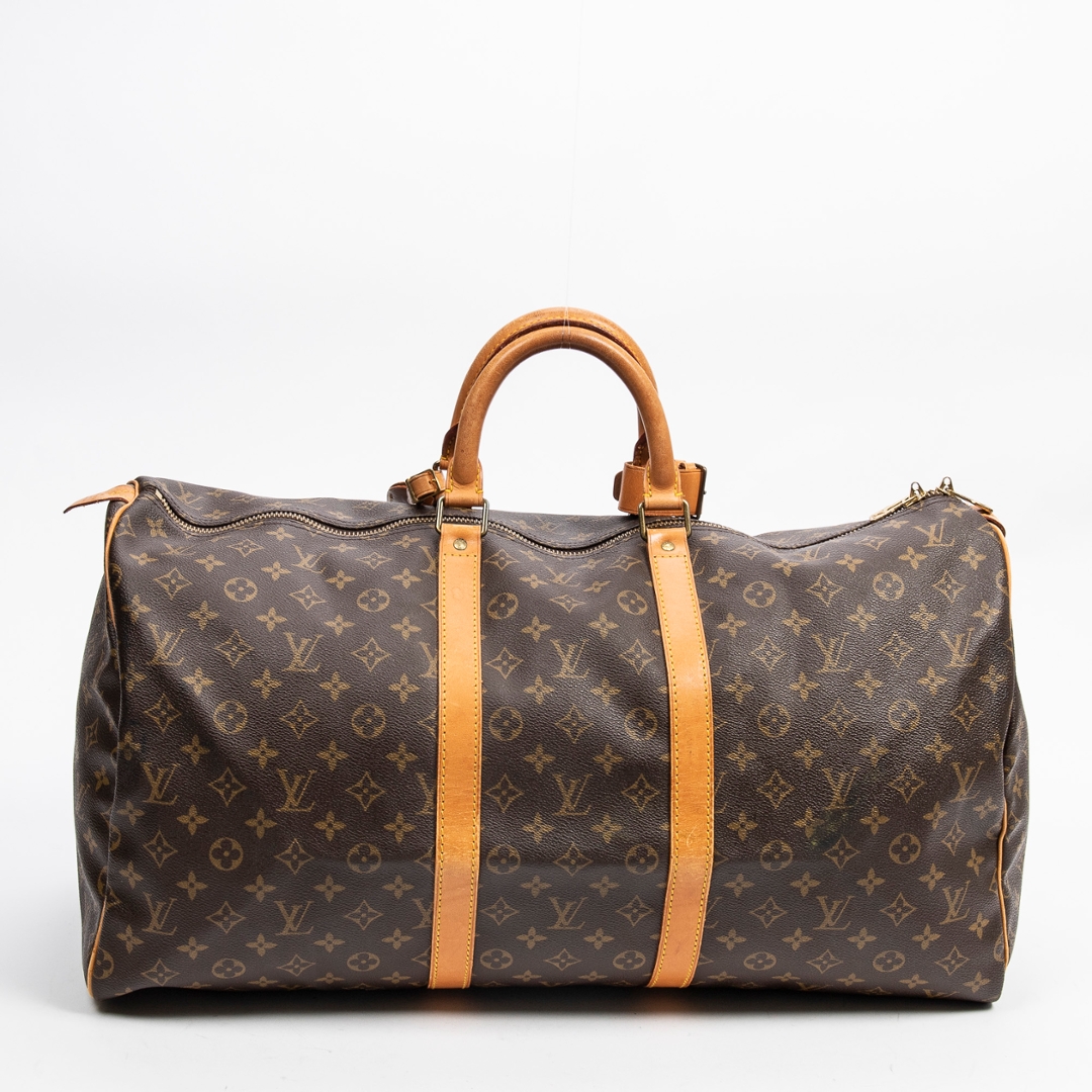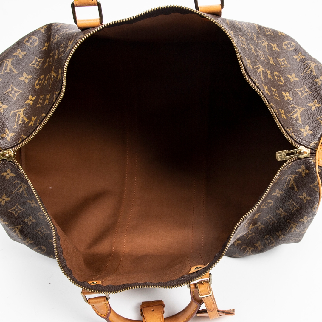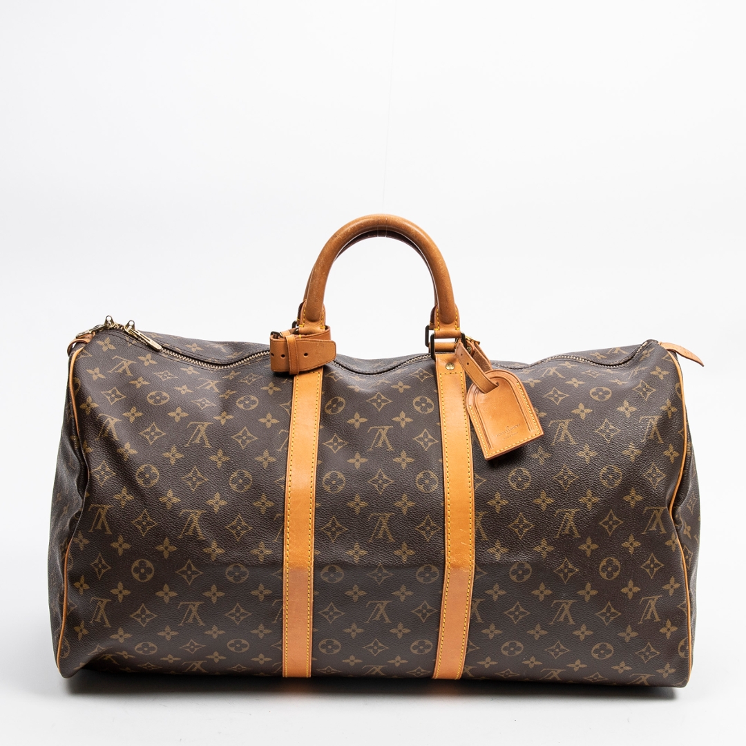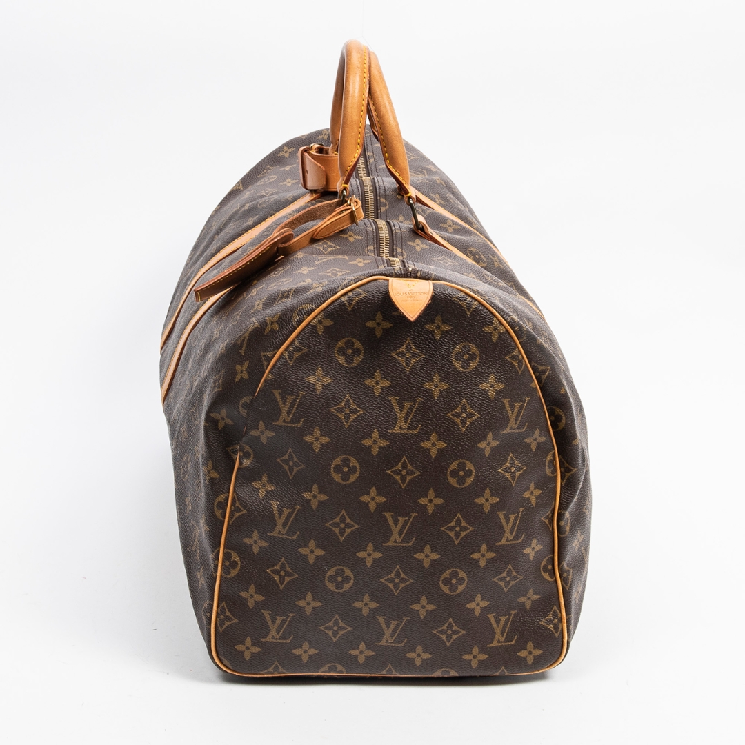 A vintage Louis Vuitton Keepall bag crafted in the iconic brown Monogram coated canvas, representing one of the house’s most celebrated and enduring travel designs. The classic silhouette is complemented by natural leather trim, rolled top handles, and signature detailing, delivering a timeless aesthetic that has defined luxury travel for decades.