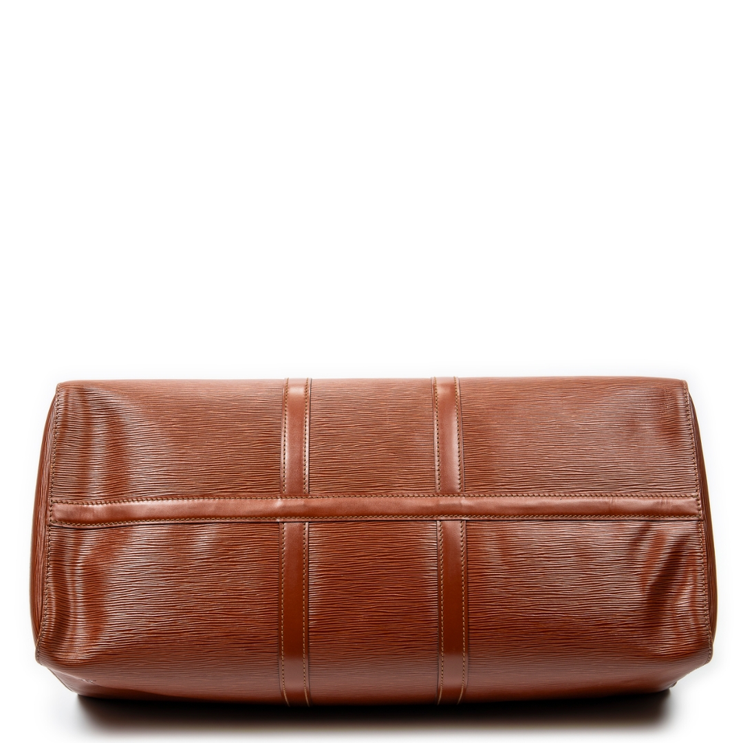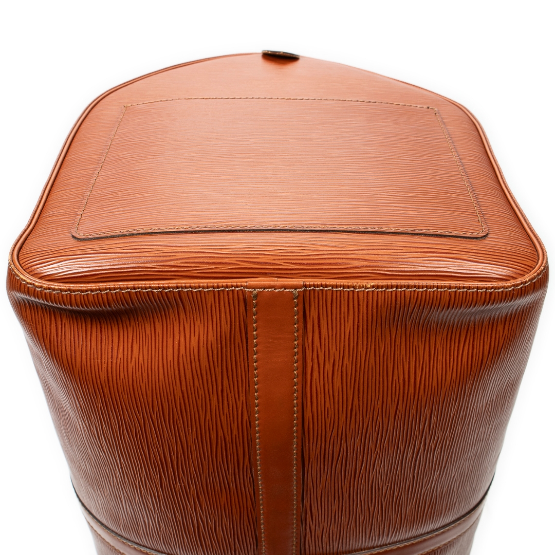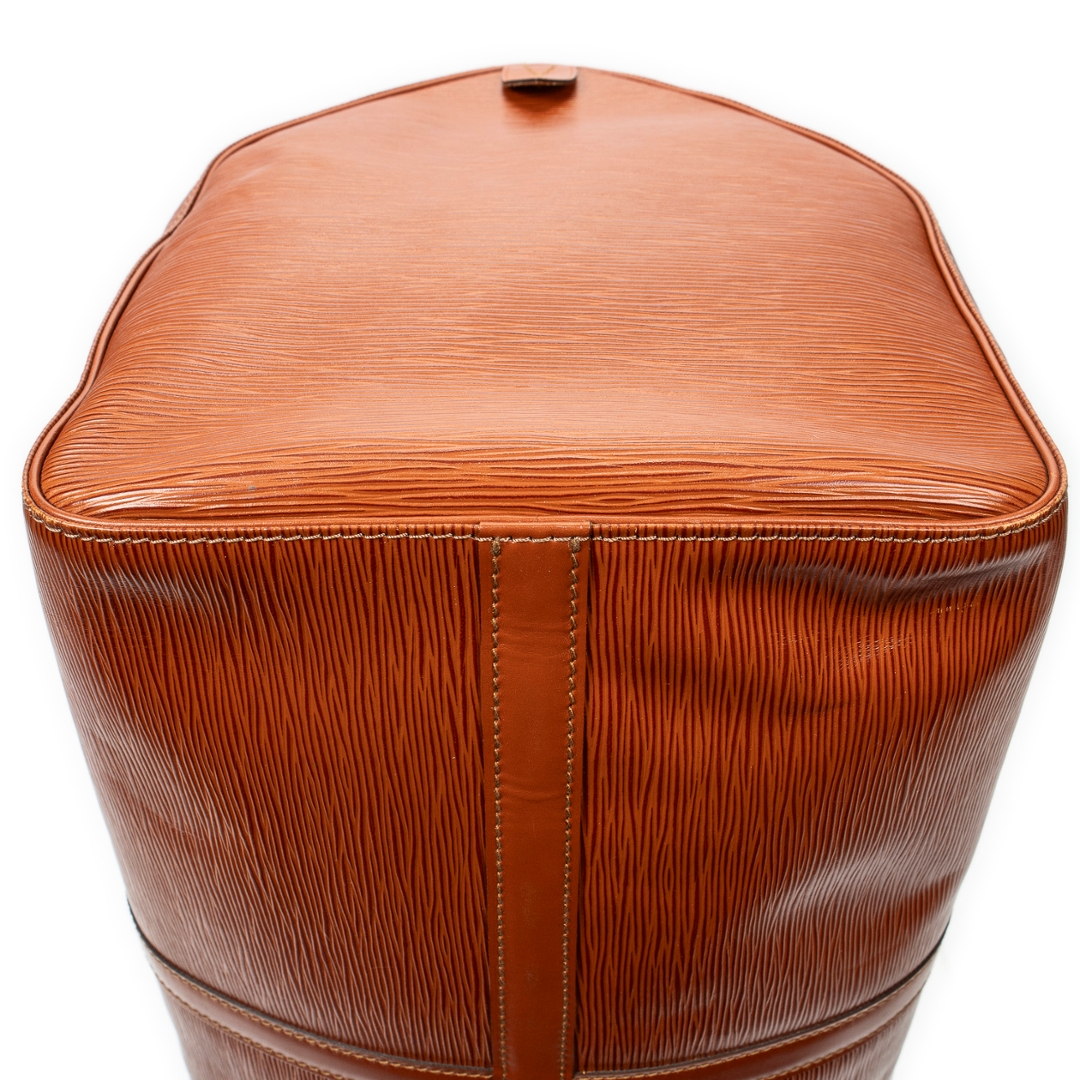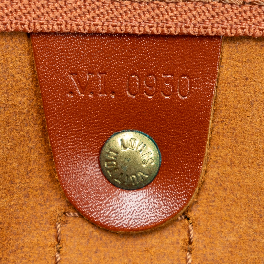 A vintage Louis Vuitton tan calf leather Keepall bag with a certificate of authenticity. Approximately 29cm height, 52cm width.