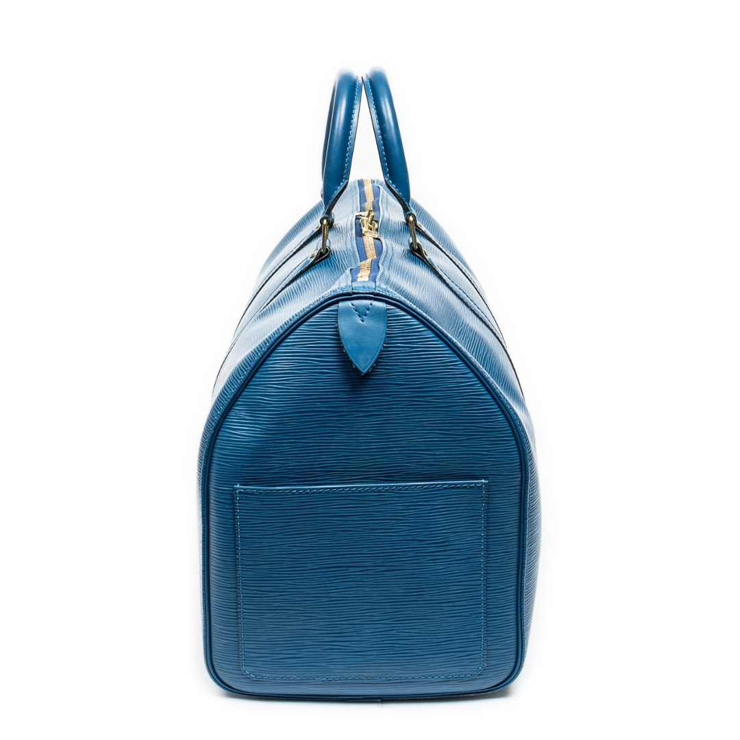 A vintage Louis Vuitton blue calf leather Keepall bag, offering a refined and contemporary take on one of the house’s most iconic travel silhouettes. Crafted from textured calf leather, the rich blue tone is complemented by tonal leather trims, structured top handles, and subtle LV embossing, creating a clean and understated luxury aesthetic.