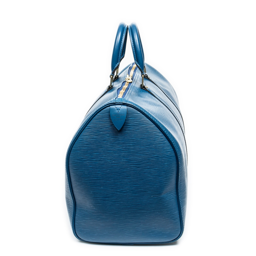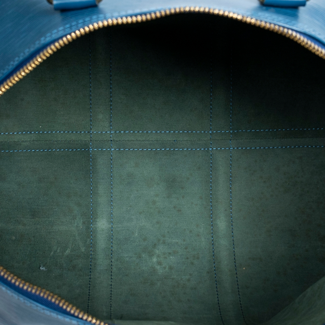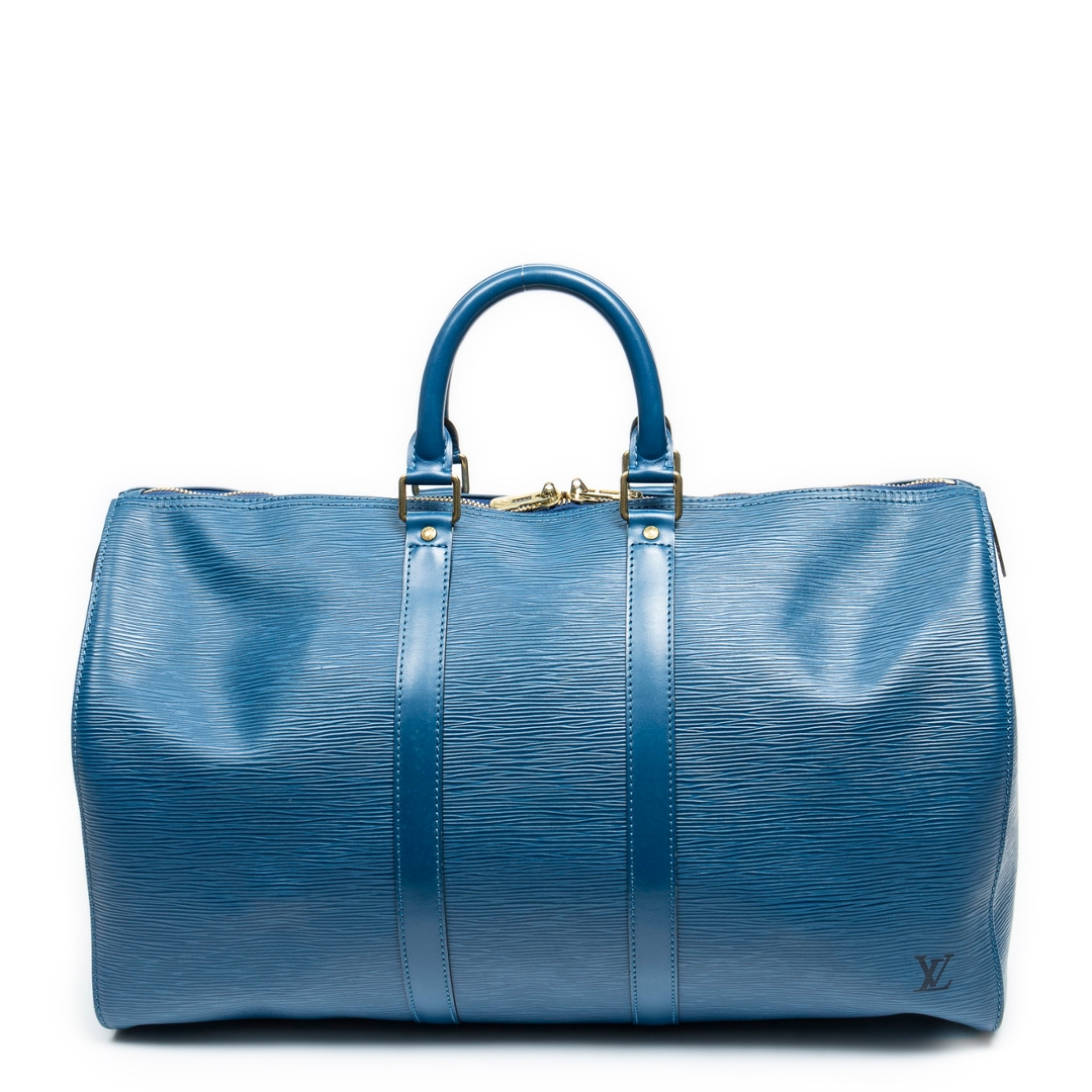 A vintage Louis Vuitton blue calf leather Keepall bag with a certificate of authenticity. Approximately 28cm height, 48cm width.