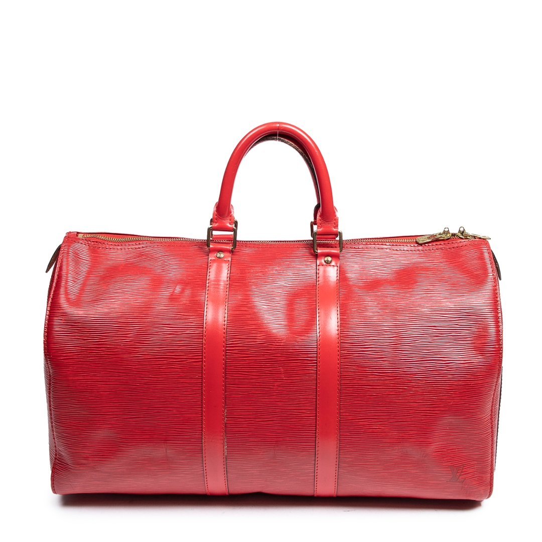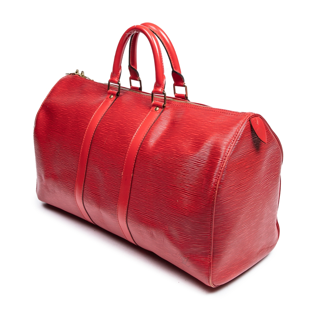 A vintage Louis Vuitton red calf leather Keepall bag, offering a bold and refined interpretation of one of the brand’s most iconic travel designs. Crafted from textured calf leather, the rich red finish is complemented by matching leather trims, structured rolled handles, and subtle LV detailing, creating a striking yet timeless aesthetic.