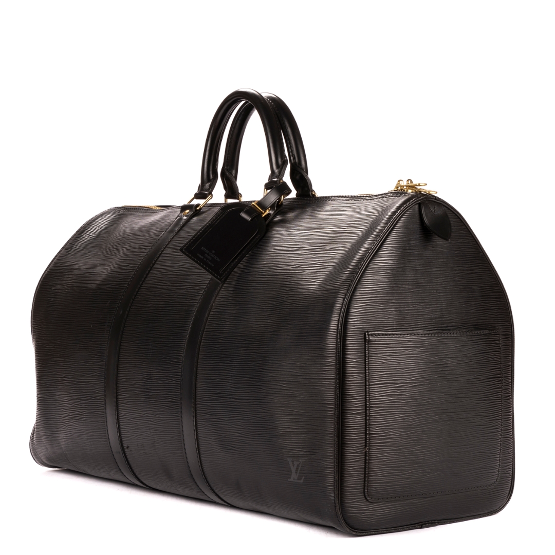 A vintage Louis Vuitton black calf leather Keepall bag, presenting a refined and understated take on the house’s iconic travel silhouette. Crafted from textured calf leather, the deep black finish is complemented by matching leather trims, structured rolled handles, and subtle LV detailing, delivering a clean, timeless aesthetic suited to both travel and everyday use.