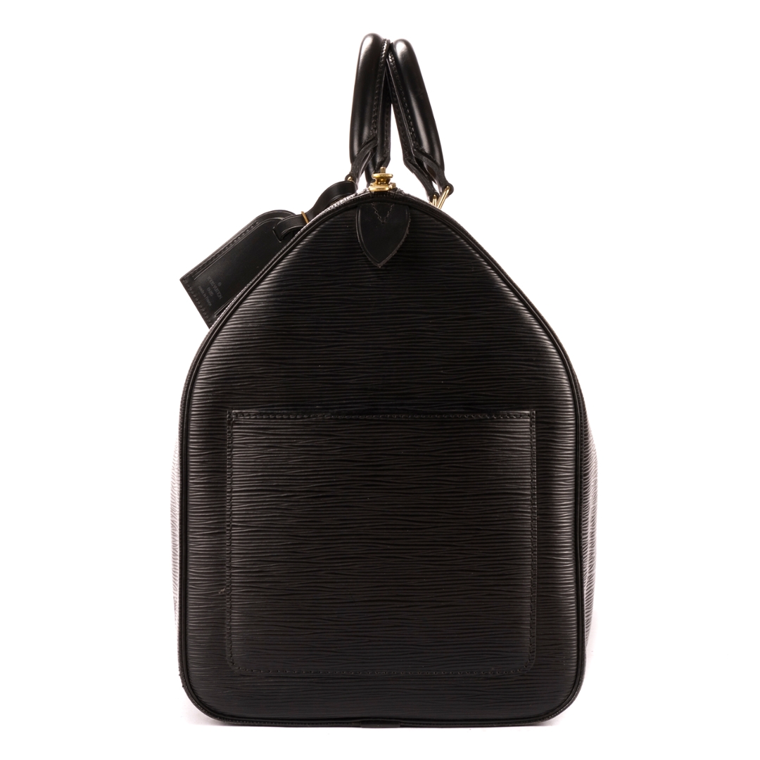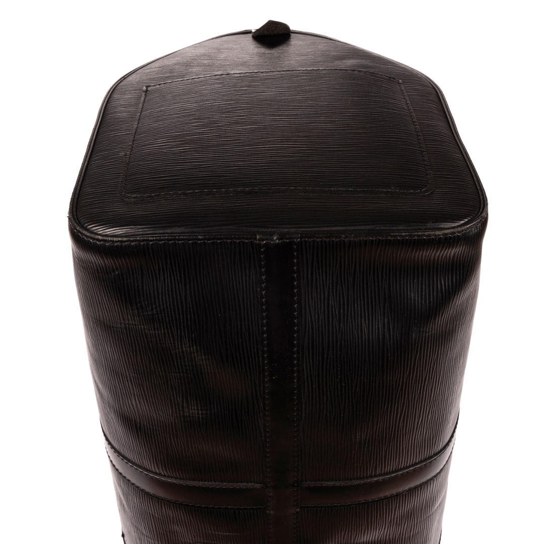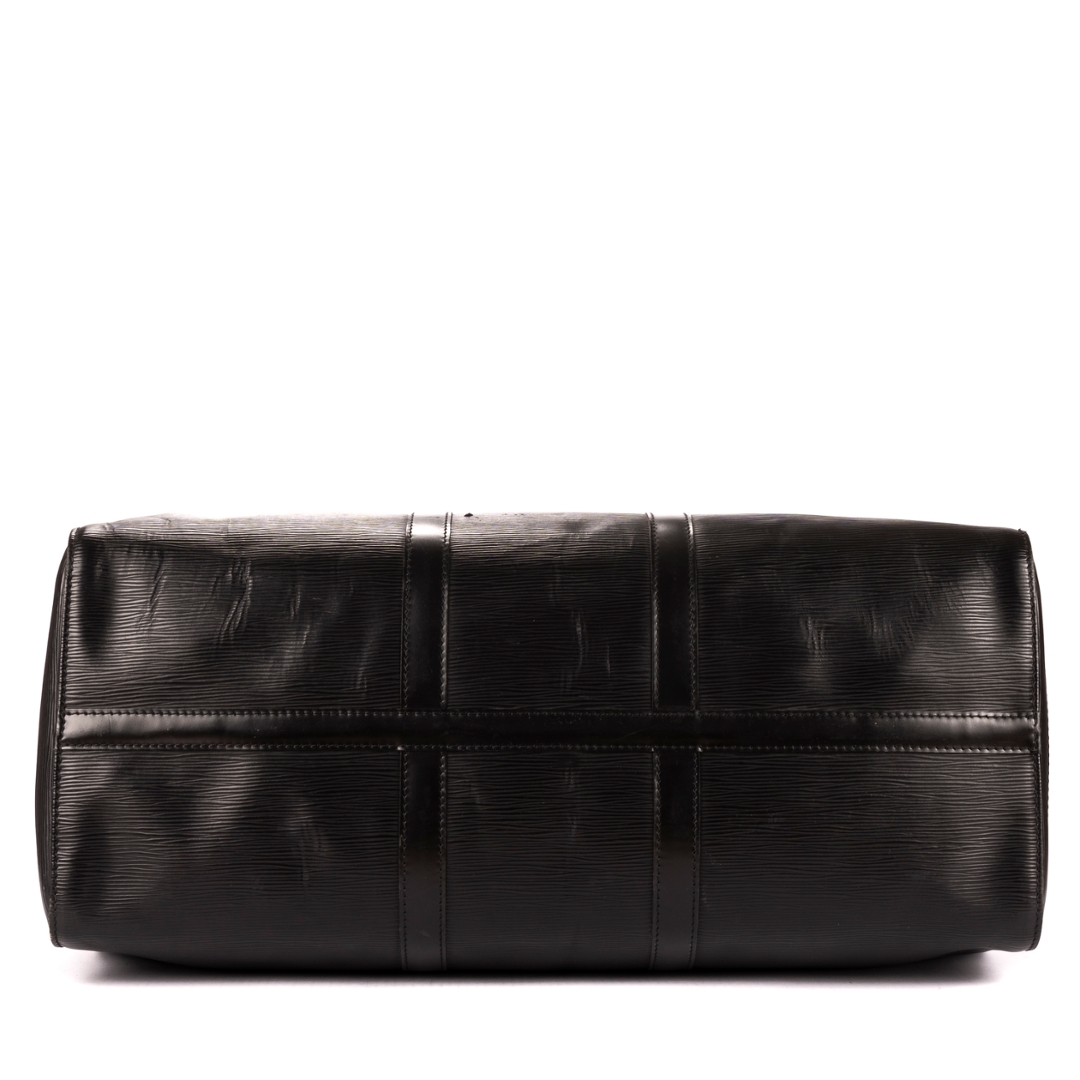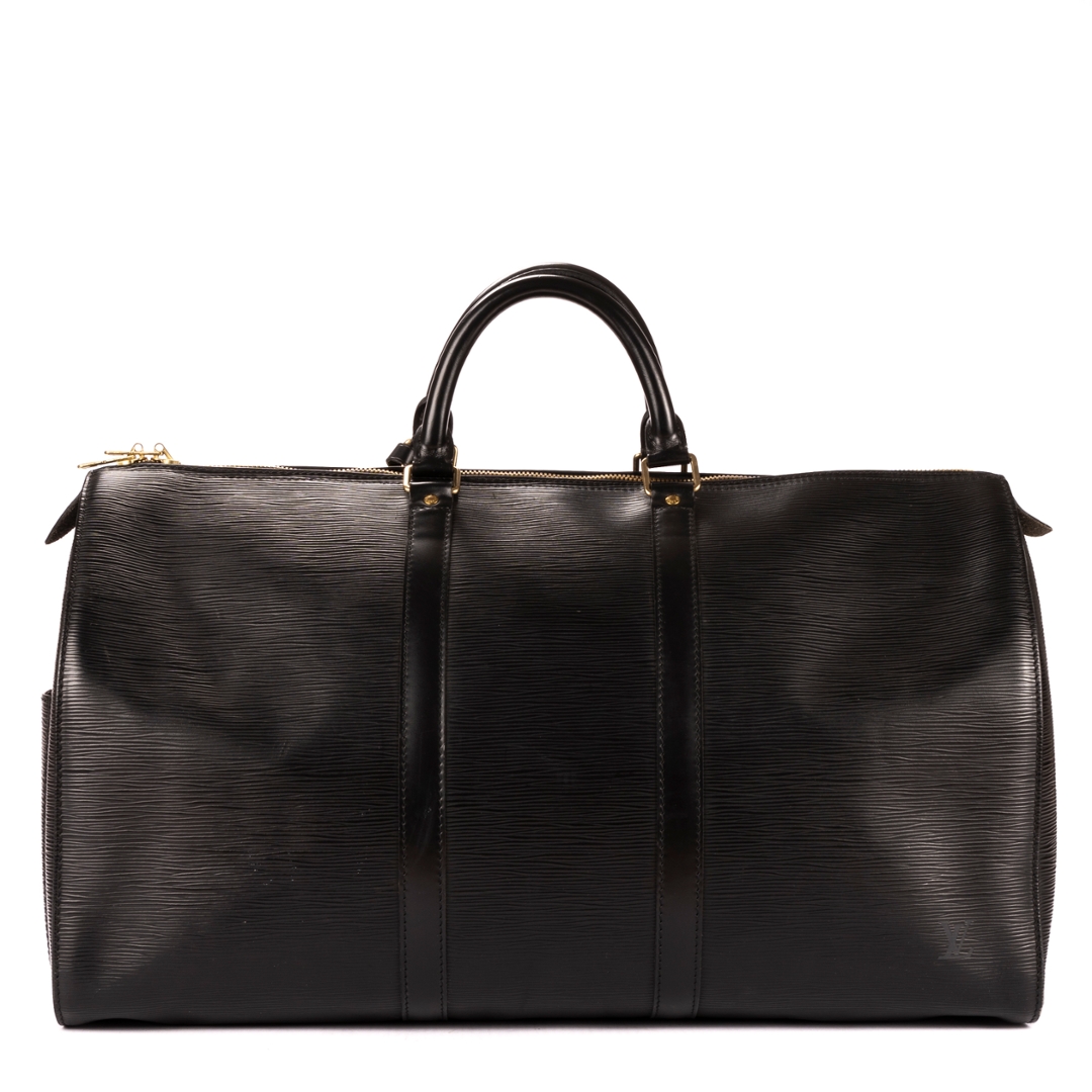 A vintage Louis Vuitton black calf leather Keepall bag with a certificate of authenticity. Approximately 29cm height, 52cm width.